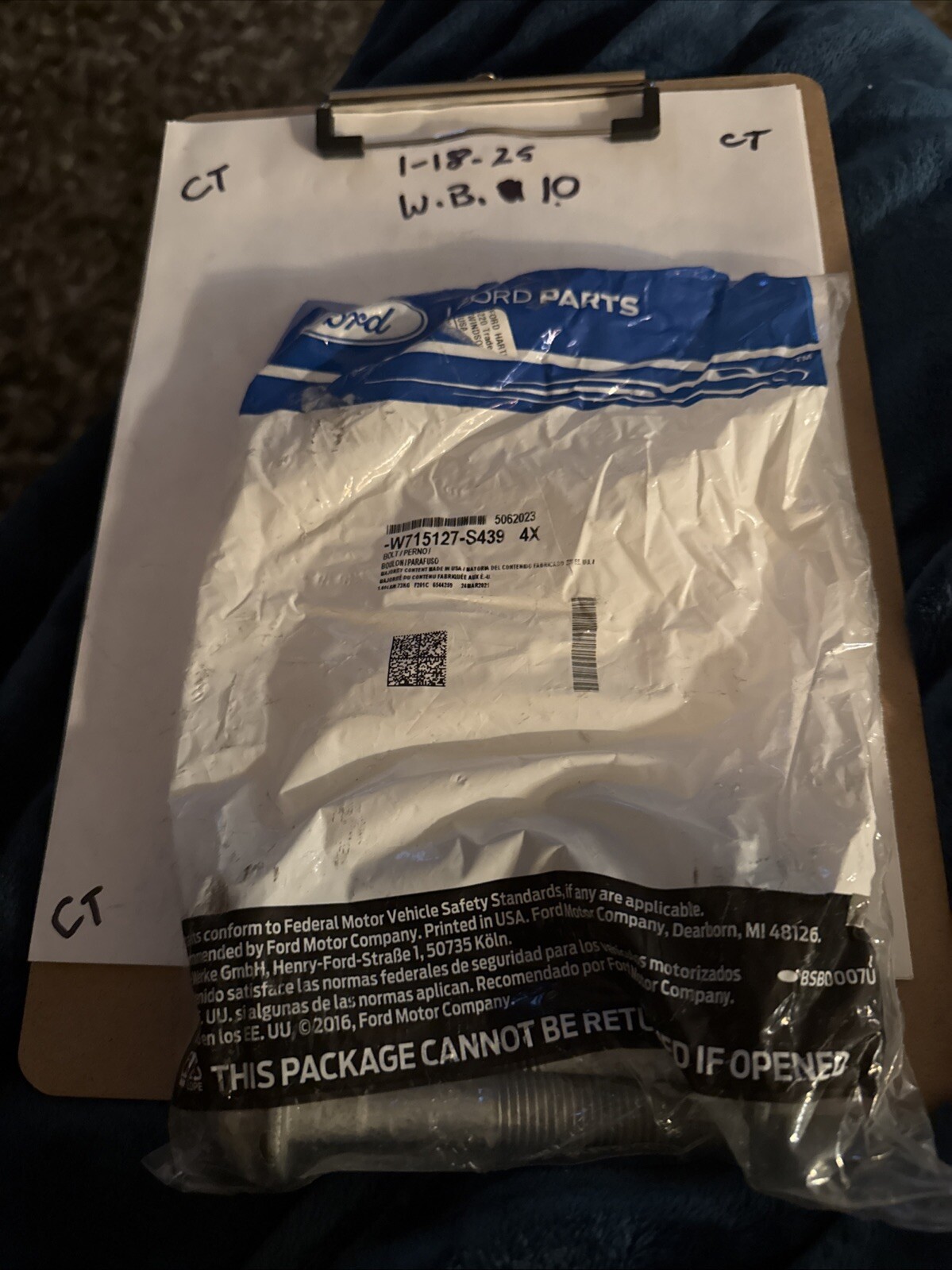 This is a genuine OEM FORD Lower Control Arm Front Bolt, part number W715127S439, designed for direct replacement in the rear suspension of a vehicle. It is a single bolt included in the package and is manufactured in the United States. The item is sold individually and is a genuine OEM part with an interchange part number of K100383. Please note that there is no manufacturer warranty for this product, and it is specified that there are no returns for parts with electrical components.