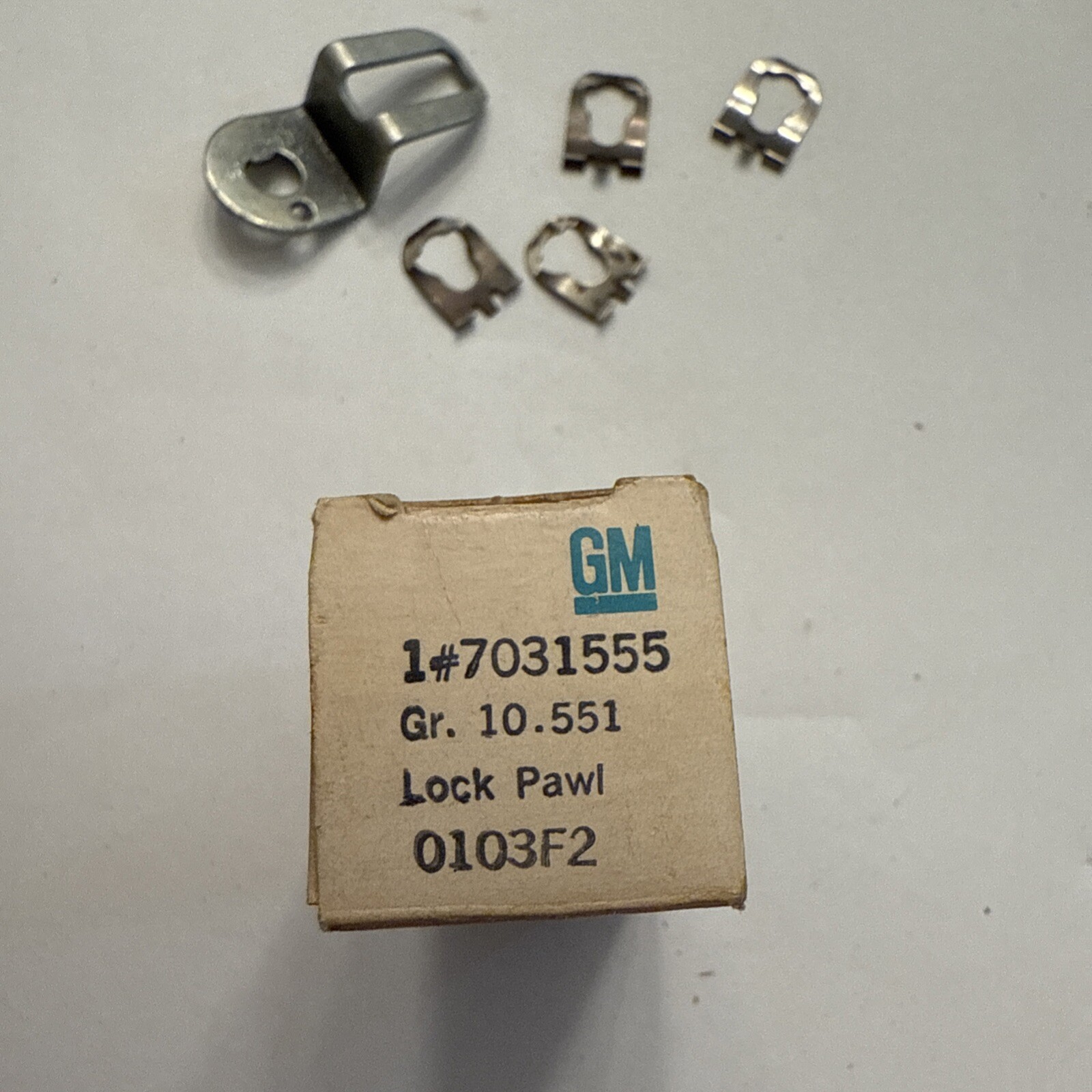 The product is a NOS (New Old Stock) door lock pawl for 1967-1970 Camaro and Firebird models. It is an original GM part with the part number 7031555. This door lock pawl is designed to fit and function as a replacement for the door lock mechanism in these classic car models, ensuring proper security and functionality of the door locks.