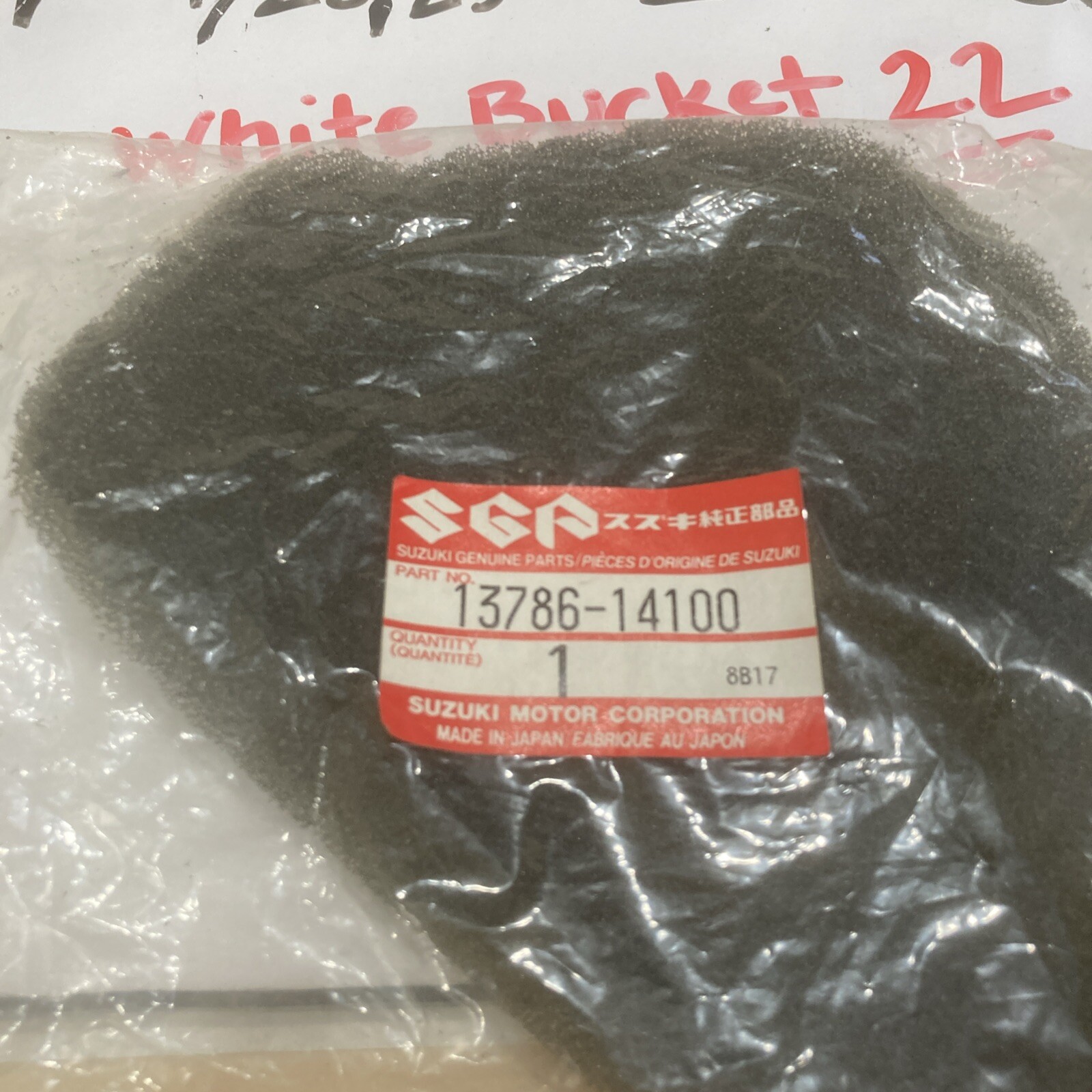 The product is a brand new old stock (NOS) outer air filter for a 1981-83 Suzuki RM 125 dirt bike. The part number is 13786-14100. This genuine OEM air filter is designed specifically for the Suzuki RM 125 model and is essential for maintaining the bike's air intake and fuel delivery system, ensuring optimal performance.