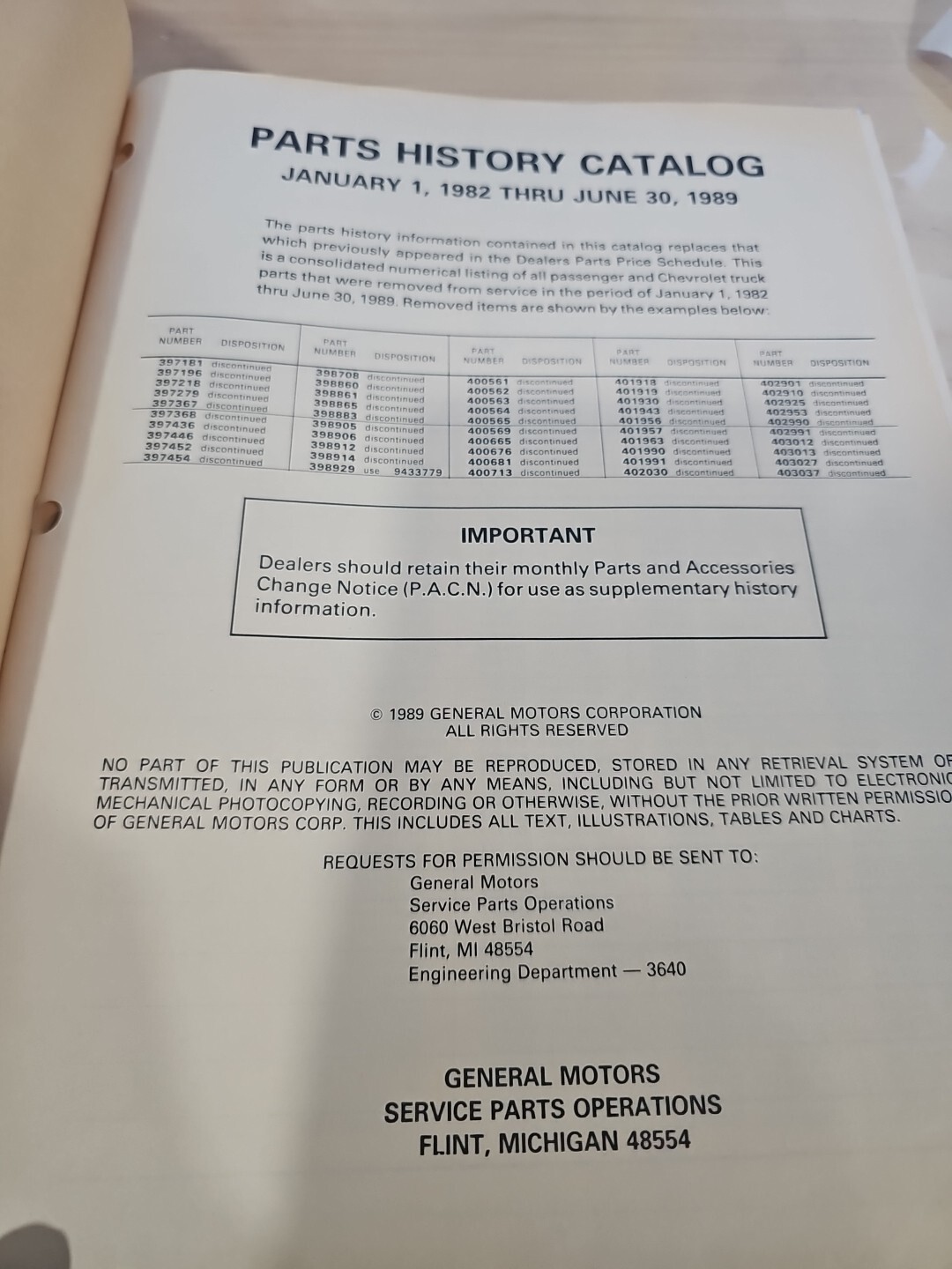 1982-1989 GM CHEVROLET PONTIAC OLDS BUICK CADILLAC DEALER PARTS HISTORY CATALOG