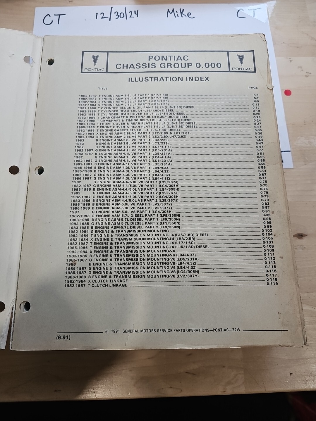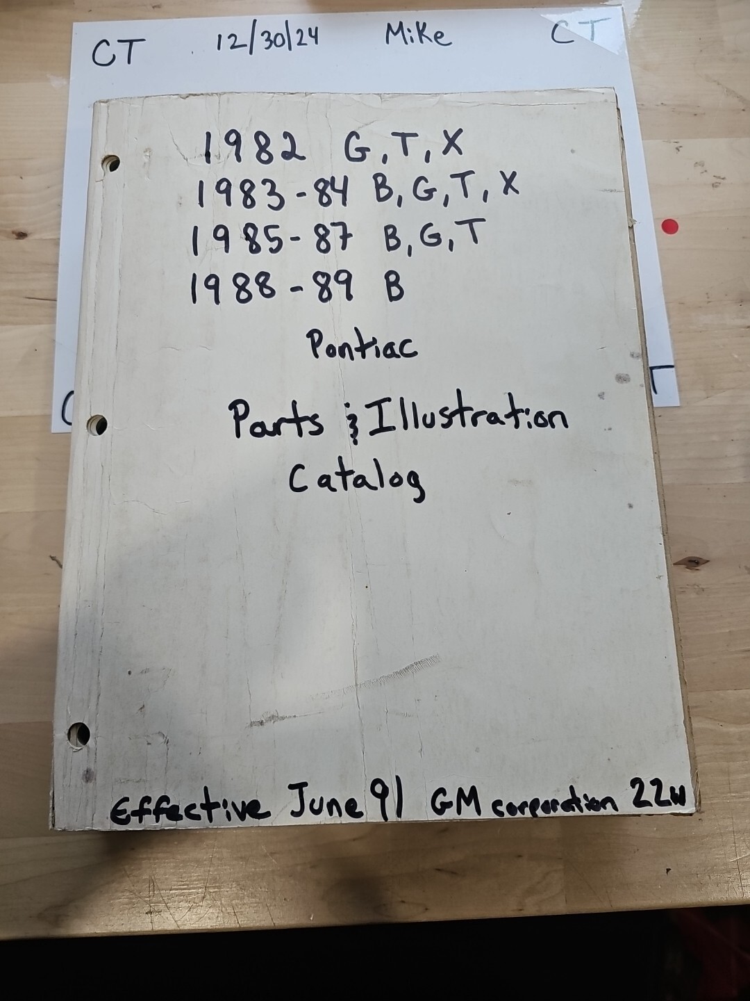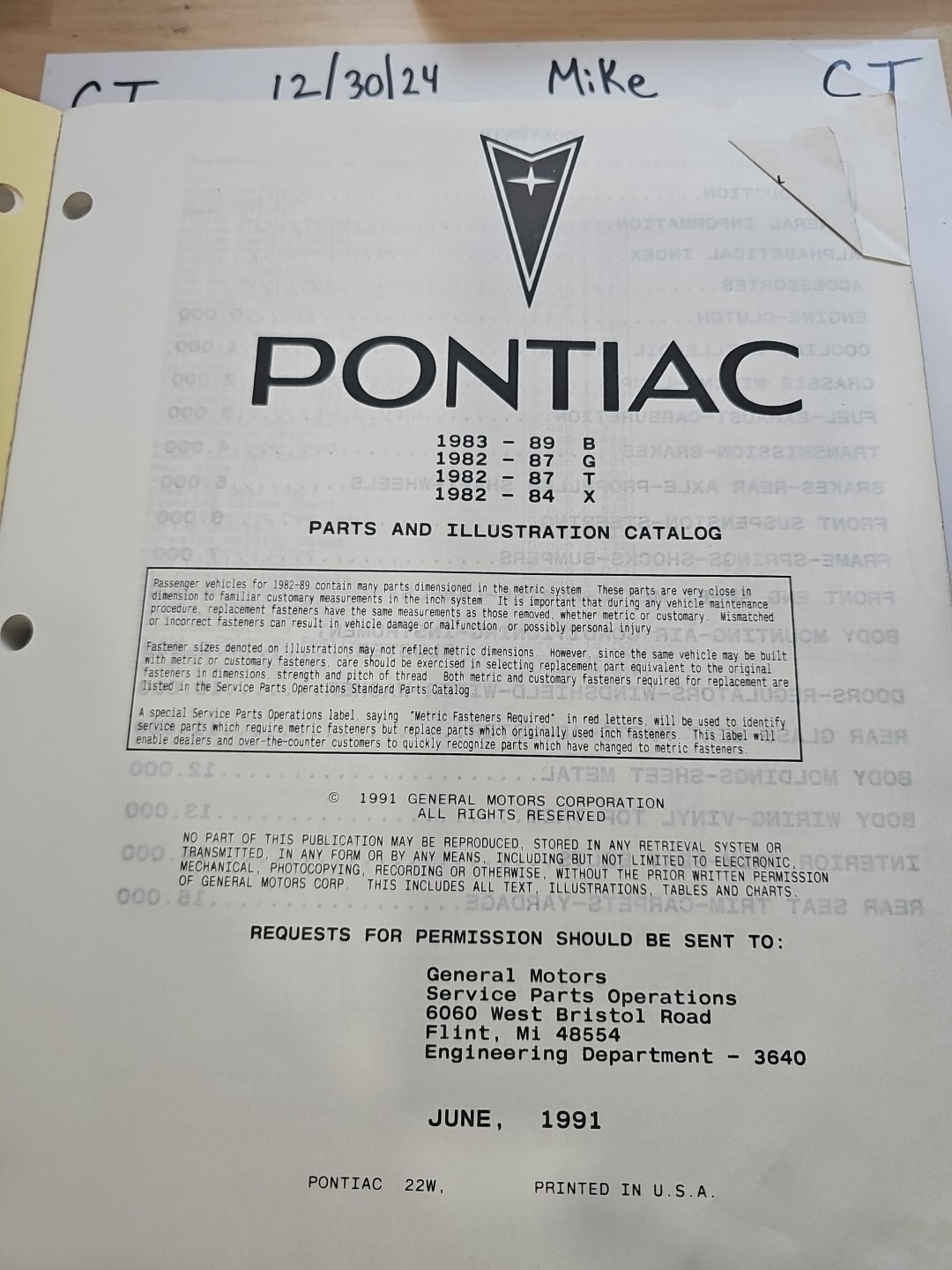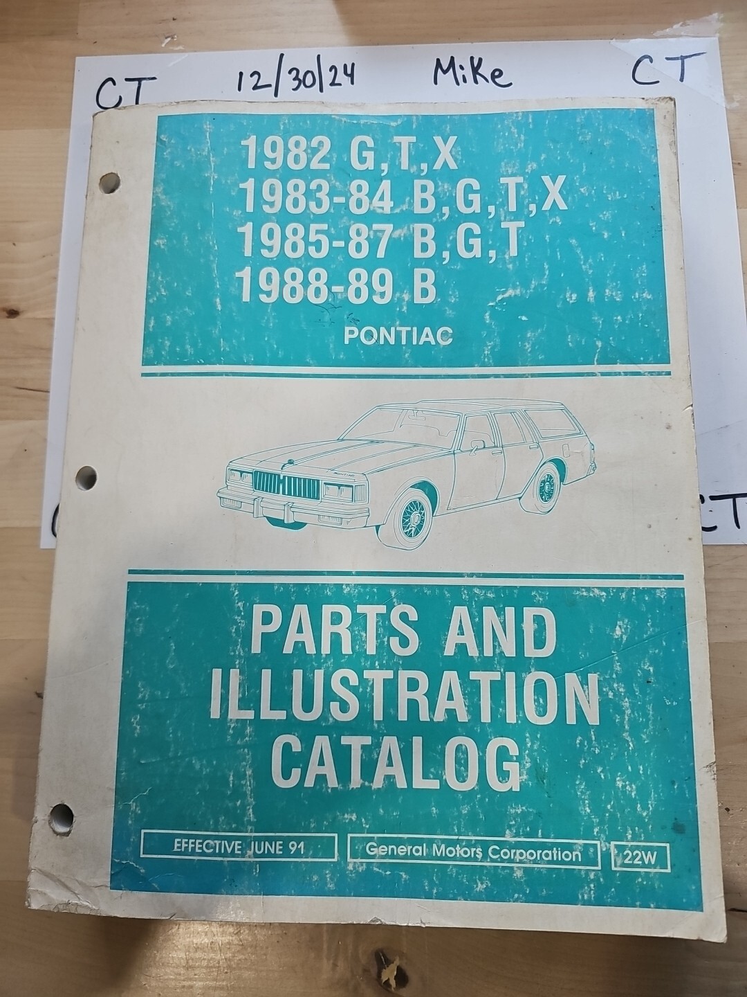 The product is a 1982 through 1989 Pontiac B G T X Parts & Illustration Catalog Manual. This paper-based manual provides detailed illustrations and information on parts for Pontiac models from the specified years. It is a valuable resource for individuals looking to identify and locate specific parts for their Pontiac B, G, T, or X series vehicles.