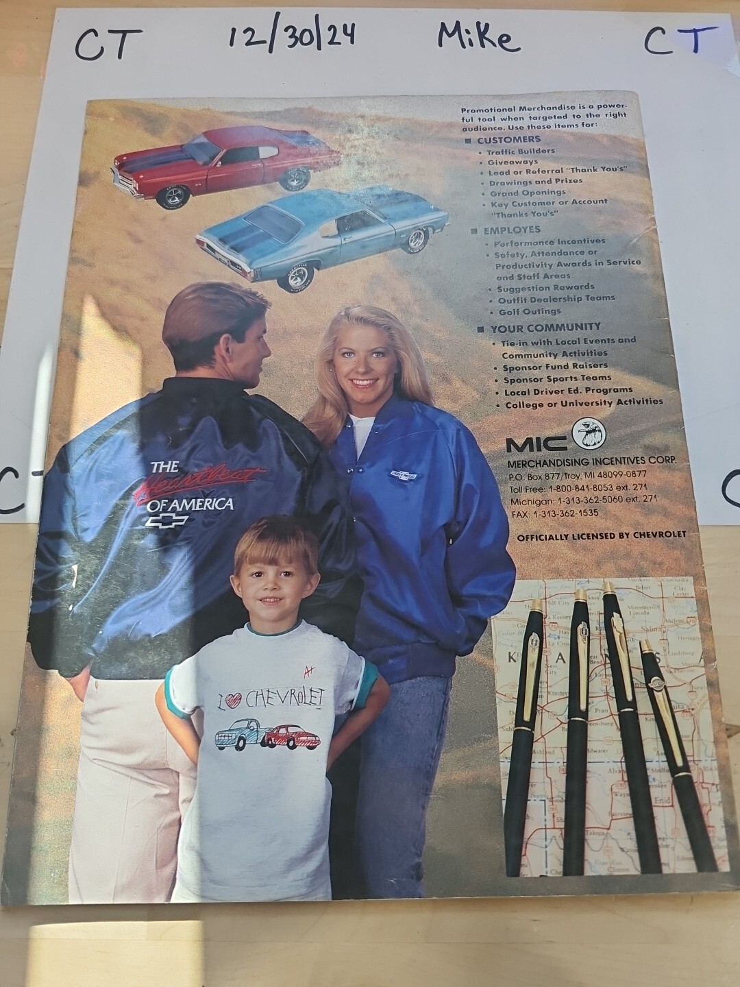 The product is a 1993 Chevy Apparel & Collectibles Catalog featuring items related to Chevrolet. It likely includes a variety of merchandise such as clothing, accessories, and collectibles all branded with the Chevrolet logo or related imagery. This catalog would appeal to fans and collectors of Chevrolet vehicles, offering a range of items for purchase that showcase the Chevrolet brand and its history.