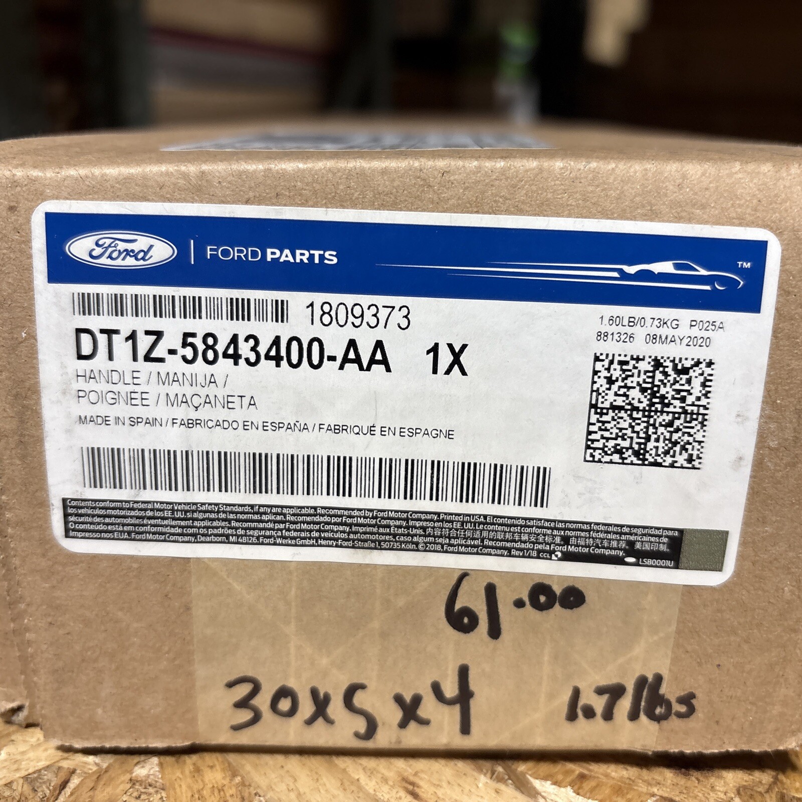 This OEM genuine tailgate handle is designed for 2014 through 2018 Ford Transit Connect vehicles. The handle has a textured finish and is made in the United States. It is specifically designed for tailgates and is not a universal fitment. The manufacturer part number is DT1Z-5843400-AA and the interchange part number is DT11-R43400-AA5CND. This is not a vintage or performance part.