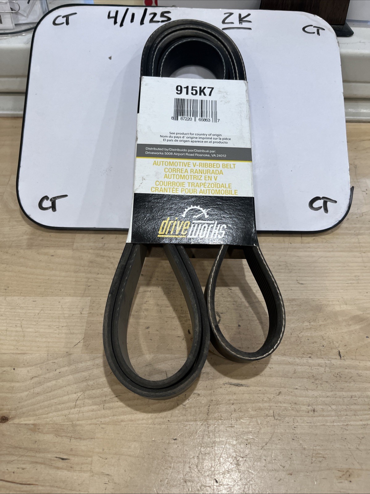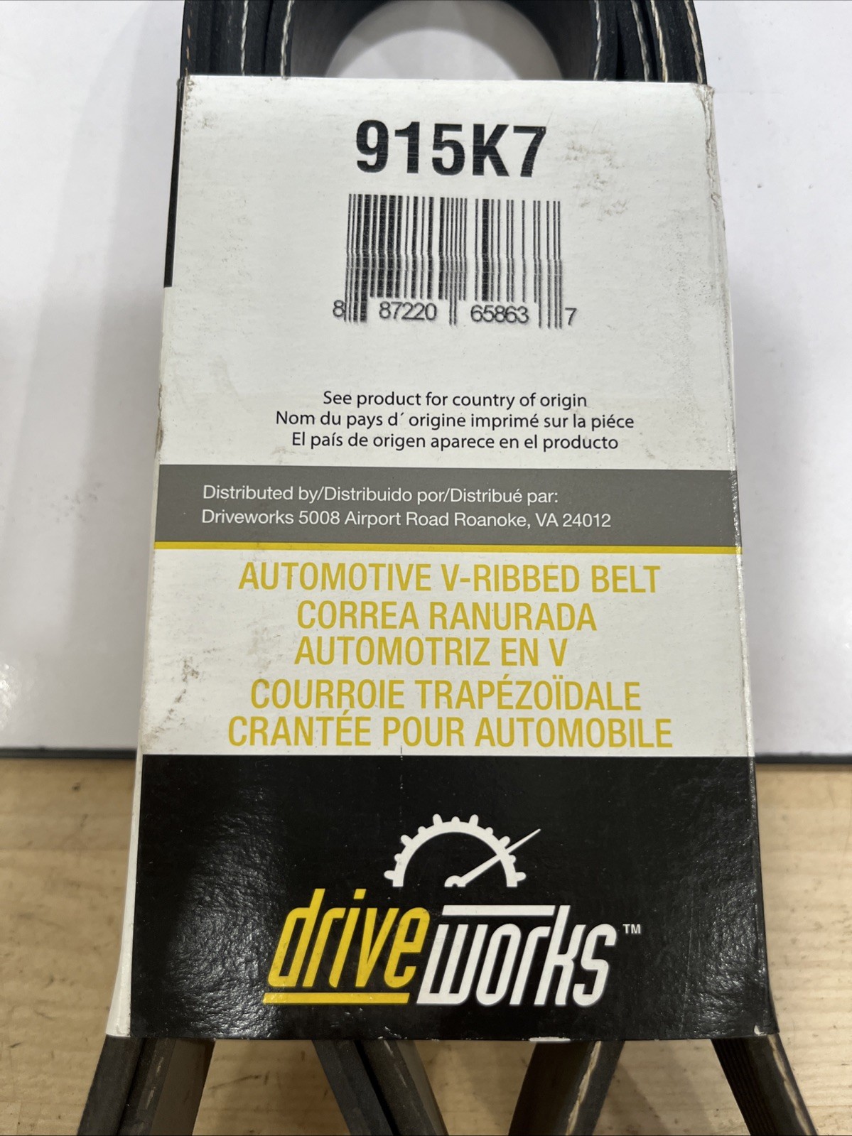 This product is a V-belt manufactured by Drive Works with the part number 915K7. It is designed for use in automotive applications and has 7 ribs. The brand of the belt is Drive Works, and it is intended for use in accessory belts for cars and trucks.