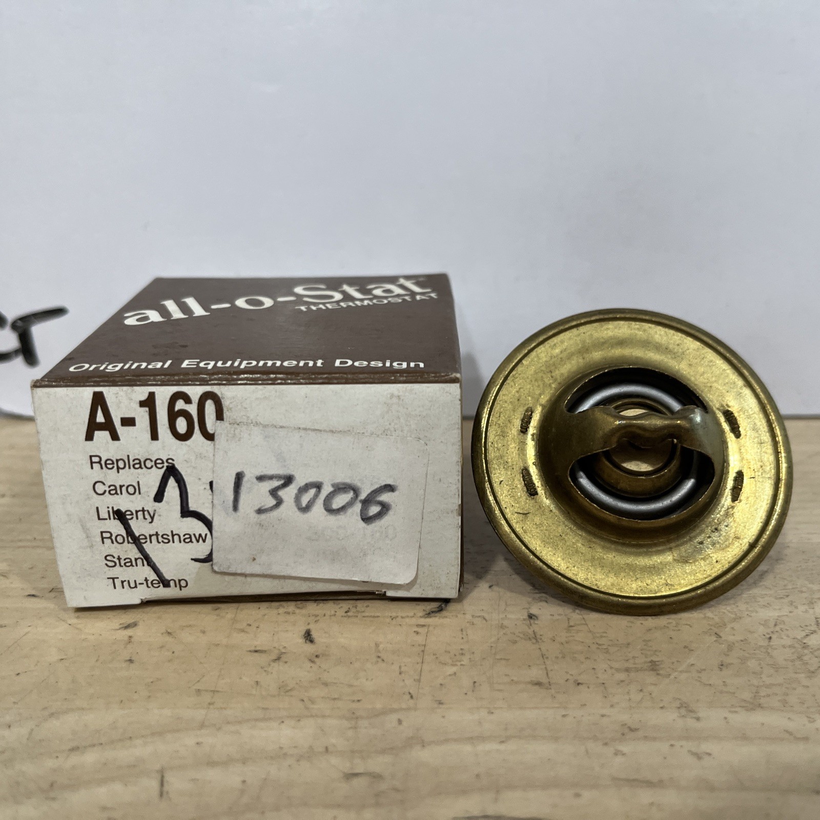 The product is an automotive thermostat made by ALL-O-STAT with the part number A-160 and interchange part number 13006. It is designed to regulate the temperature of an engine's cooling system.