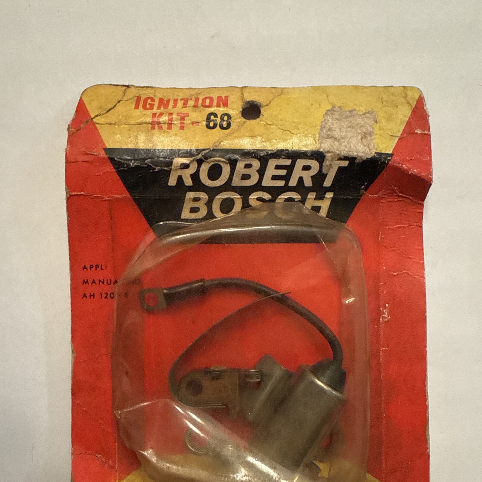 This product is a Bosch ignition kit 68 containing points and a condenser. It is a vintage ignition point set manufactured in the United States, suitable for use in cars and trucks. The kit includes a metal condenser and is designed for ignition systems maintenance and repair.