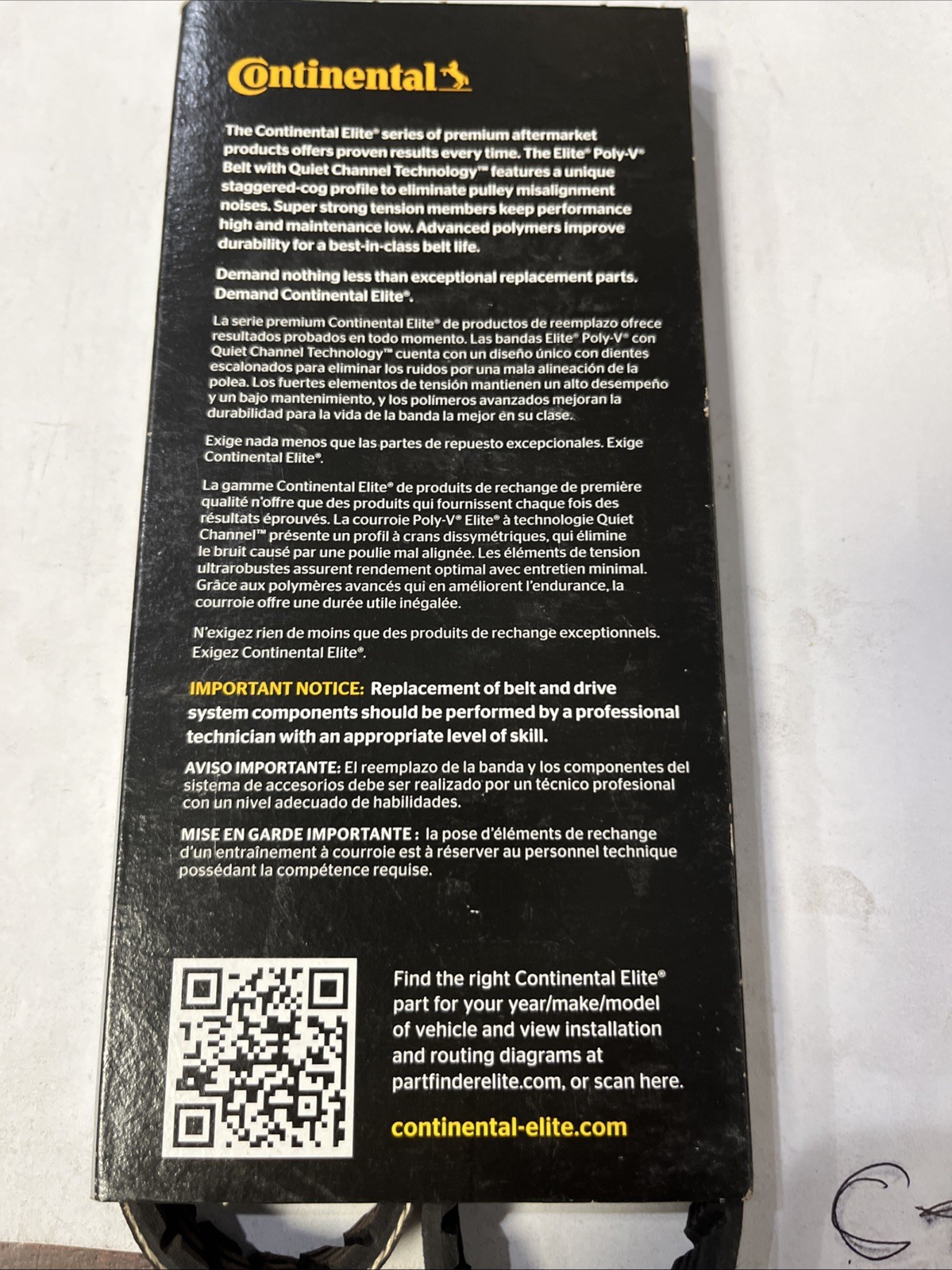 This Continental Elite serpentine belt is designed to fit most vehicles with a 4-rib belt number of ribs and a belt effective length of 33.5 inches. The belt top width is 0.54 inches and is made of durable EPDM rubber material. The package quantity is one belt and mounting hardware is not included.