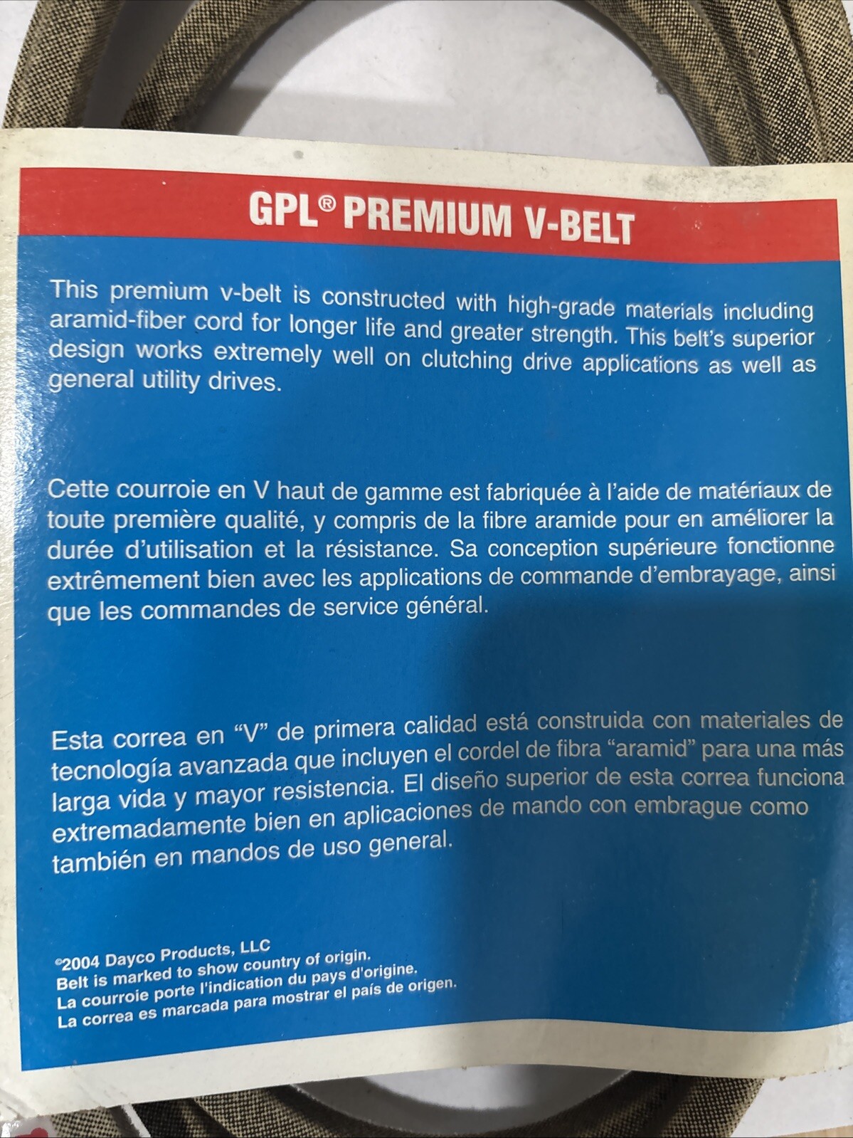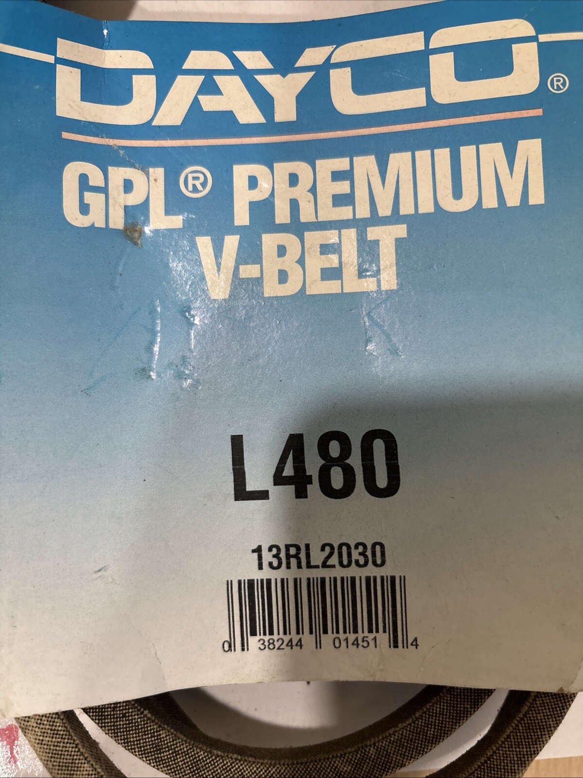 The Dayco L480 Utility V-Belt is a premium quality belt constructed with a synthetic rubber compound in a wrapped design. It has an outside circumference of 80.00 inches, a top width of .500 inches, and an angle of 40 degrees. This V-Belt is manufactured by Dayco in the United States and features a banded belt design. The product is identified by manufacturer part number L480 and is part of the Dayco GPL 13RL2030 series.