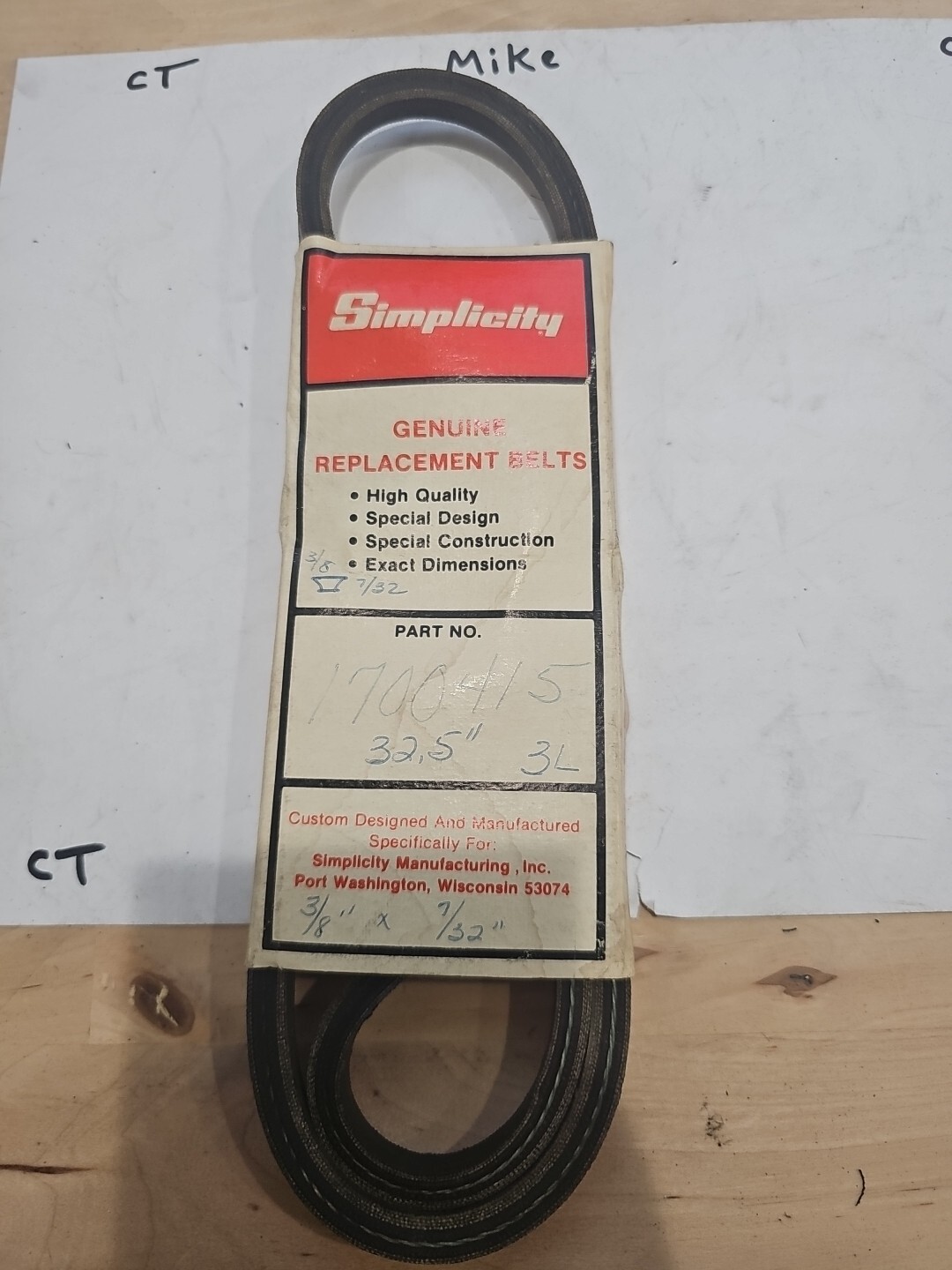 This simplicity PowerDrive belt is a heavy duty aramid replacement belt that fits Simplicity Manufacturing equipment. It has a belt type of V-belt and a model number of 1700415. The bullet point states that it is a belt 3LK 3/8 x 32in OC. This product is categorized under business and industrial, industrial automation and motion controls, mechanical power transmission, and power transmission belts.