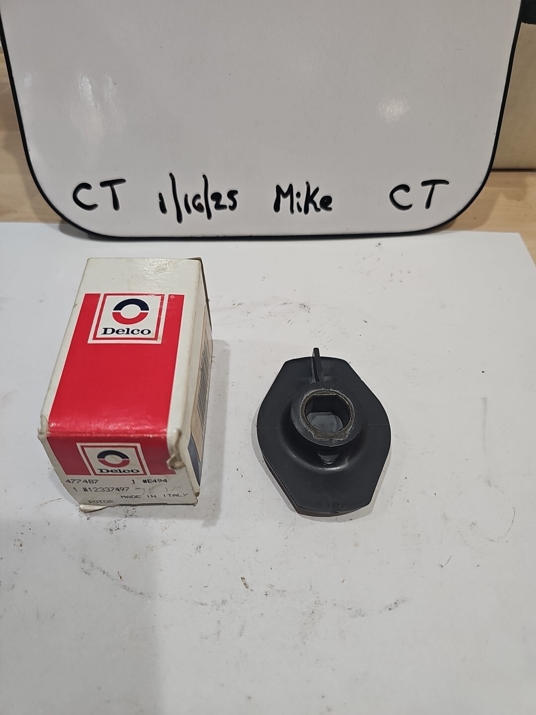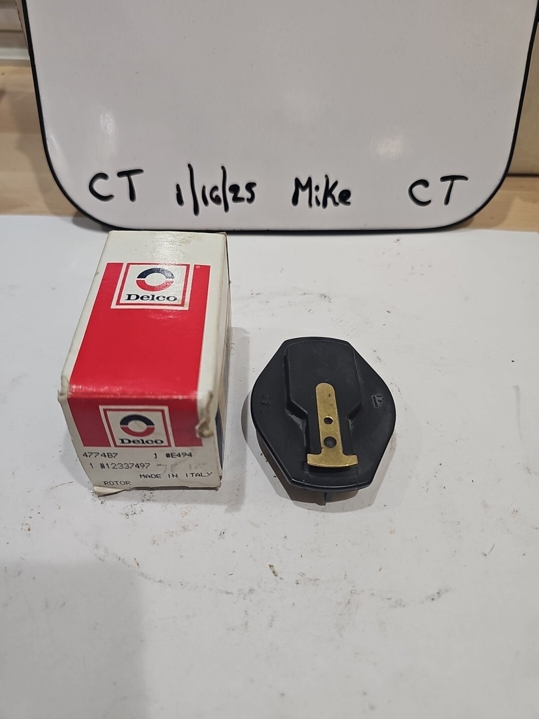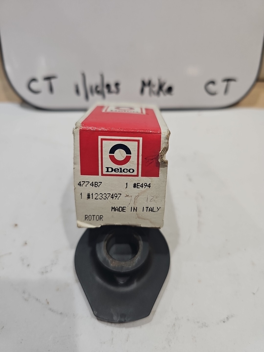 The product is a Delco GM Ignition Rotor with the part number 4774B7, also known by GM part number 12337497 and Delco part number E494 (D447). This white distributor rotor is a new old stock (NOS) item manufactured in the United States. It is designed for use in ignition systems of cars and trucks, specifically in the distributor assembly. The rotor is a genuine Delco product, ensuring quality and compatibility with GM vehicles.