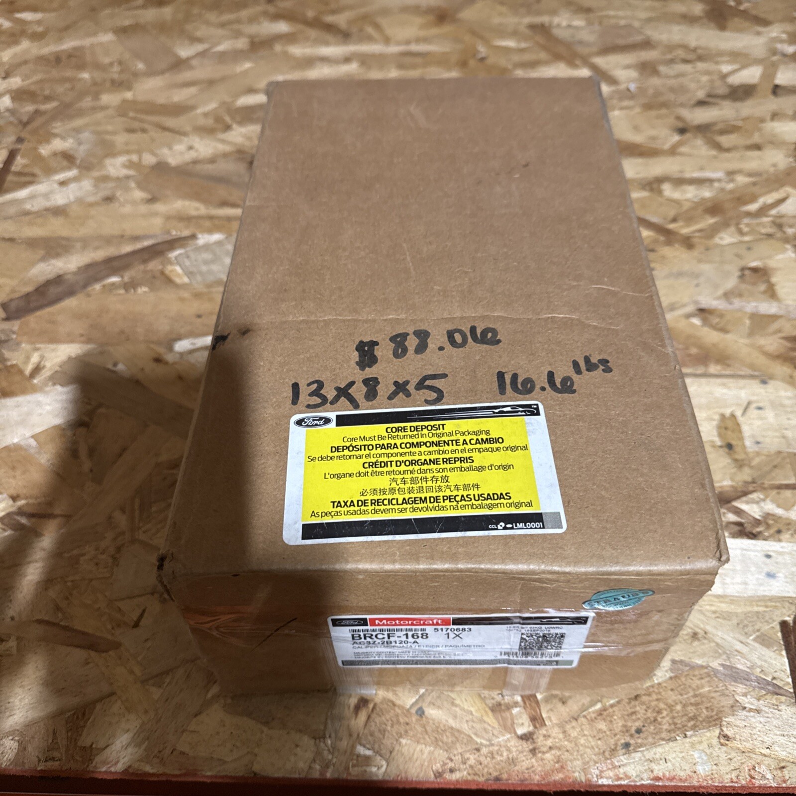 The product is a Motorcraft Disc Brake Caliper with a Manufacturer Part Number of BRCF-168. It is an unloaded caliper with a core charge of $50.00, which is already included in the total price. The quantity available is 1, and the SKU is 189:BRCF-168. This disc brake caliper is designed for use in car and truck brake systems, specifically for replacing or upgrading existing calipers. The Motorcraft brand is known for producing high-quality automotive parts, making this caliper a reliable option for brake maintenance or repair.