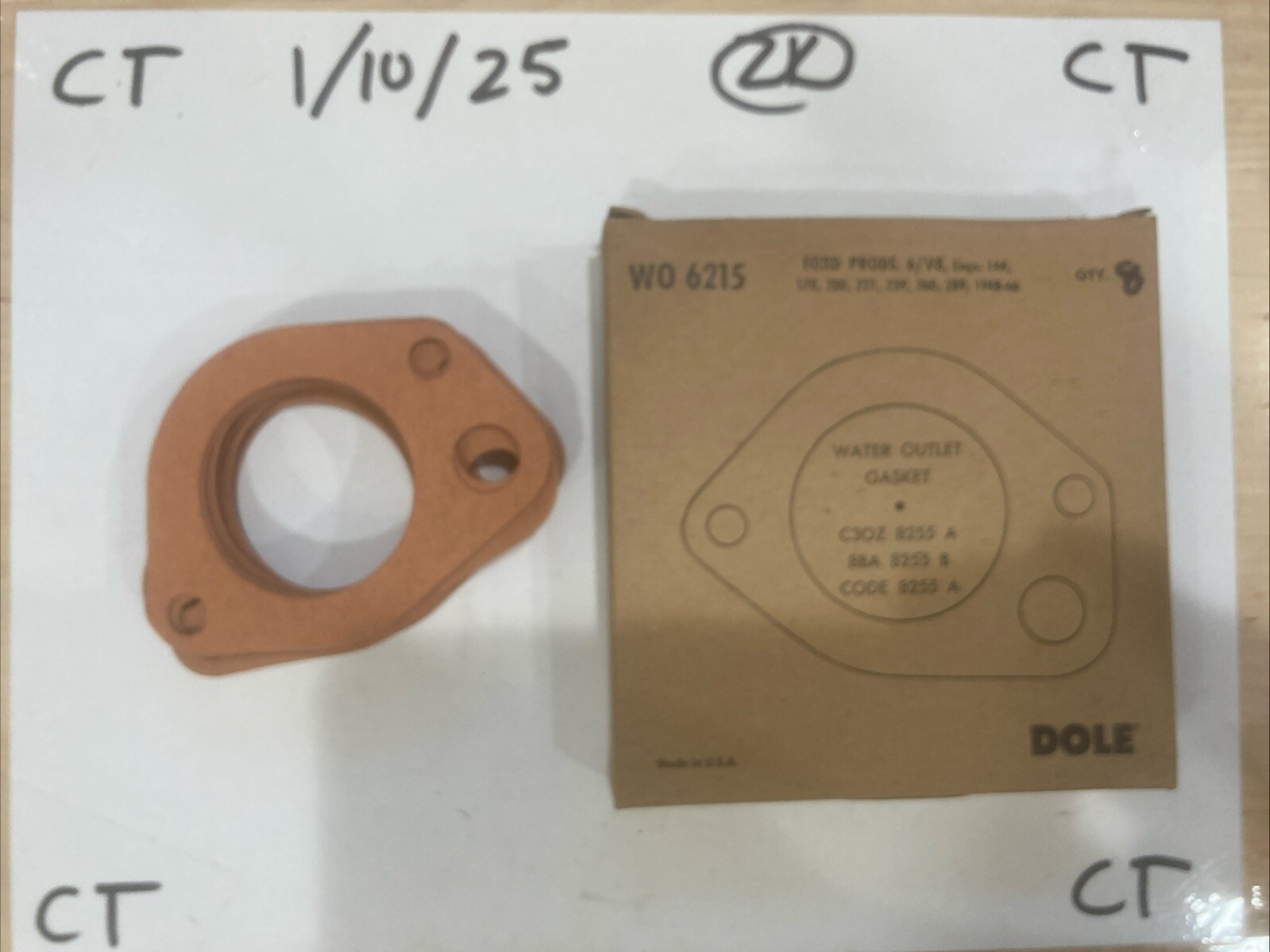 The product is a pack of 8 Dole water outlet gaskets, designed for use in engine cooling components. The gaskets are orange in color with 3 bolt hole quantity, manufactured with the manufacturer part number WO6215. These gaskets are essential for creating a secure seal in the water outlet of a vehicle's engine, helping to prevent leaks and maintain proper cooling system function.