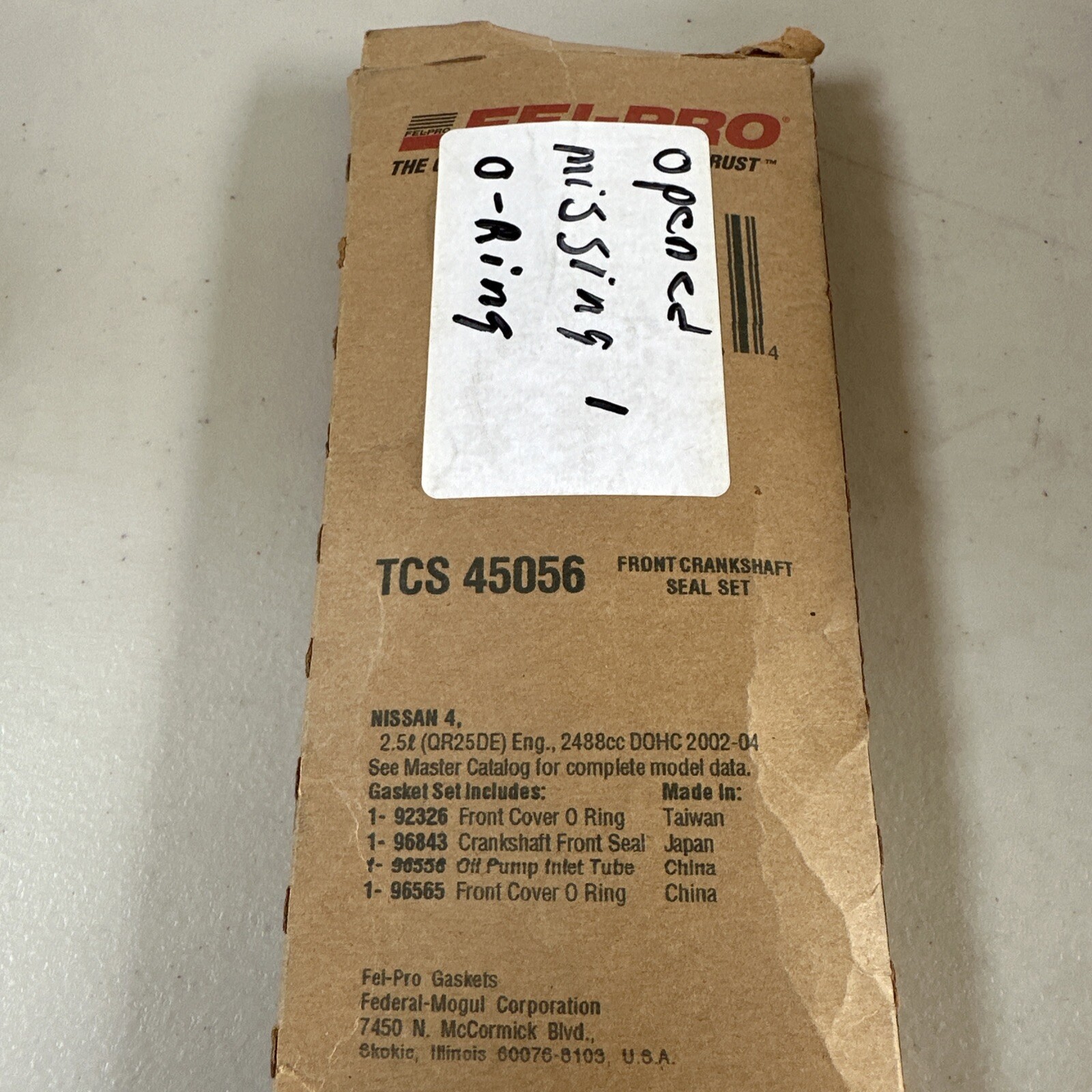 The Fel-Pro TCS 45056 crankshaft front seal set is specifically designed for the front placement of your vehicle. It comes with a manufacturer part number that guarantees its quality. Whether you're replacing a worn-out seal or upgrading your engine, this set is the perfect choice. It fits all Nissan Rogue 2014 2.5L models and is easy to install. Missing 1 O ring