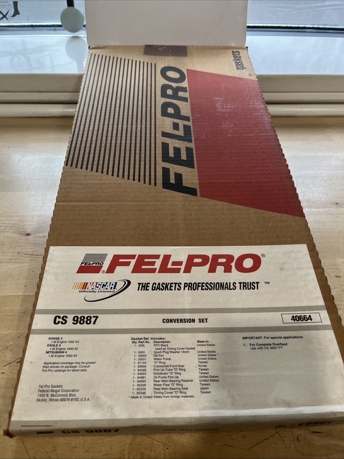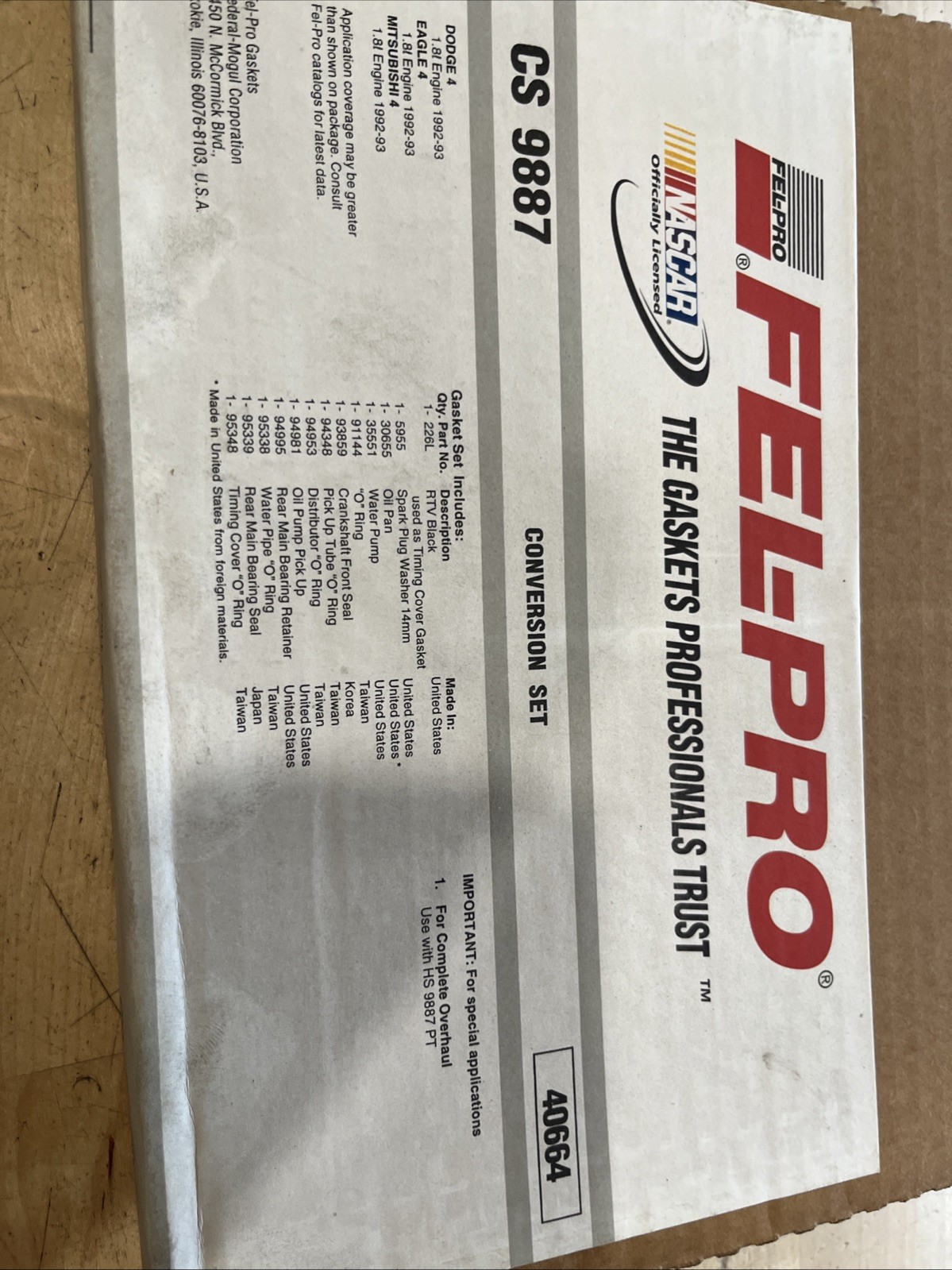 This product is a conversion gasket set made by Fel-Pro, with the OE/OEM part number 40664. It is designed to fit various car and truck models and is suitable for use in the automotive industry. The manufacturer part number is CS 9887.