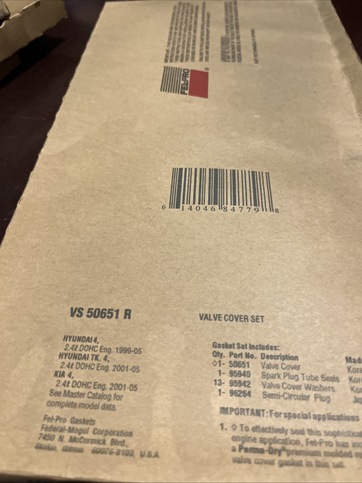This is a Felpro Gasket Set VS 50651 R, designed for use in Hyundai and Kia models such as the Sonata, Santa Fe, Optima, and Magentis. It is a direct replacement valve cover gasket set made of rubber material, with a PermaDry™ series design. The placement on the vehicle is specified as "Need One". The items included in this purchase are a gasket and a valve cover set, and it is suitable for use in engines.