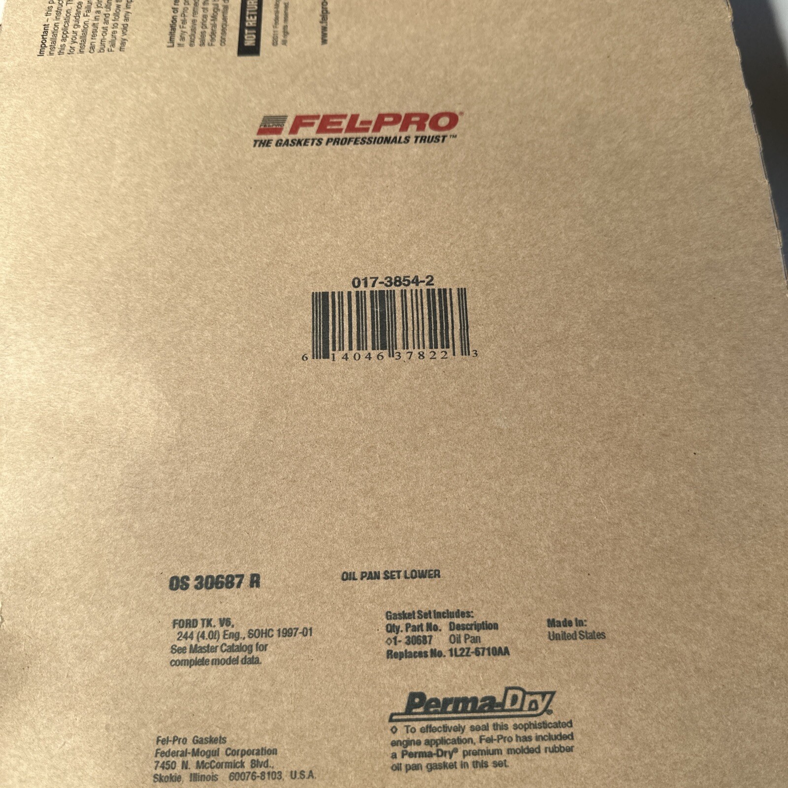 The gasket set is compatible with a variety of vehicles and part numbers, including OS32246, 4L2Z 6710-AA, OS6290P, 16789, and 1L2Z6710AA. It is made in the United States and has a length of 17.300 inches. The placement on the vehicle is lower, ensuring that it will fit snugly and provide a proper seal.