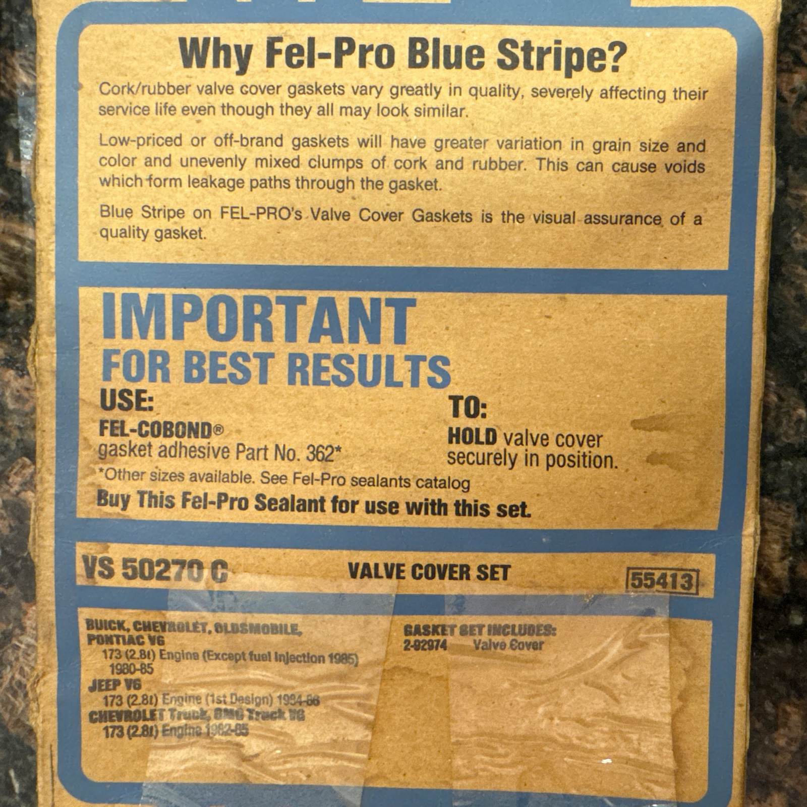 The product is a Fel-Pro Valve Cover Gasket Set with manufacturer part number VS50270C designed for 1980-1986 Buick, Pontiac, and Chevrolet 173 engines. It is a specific type of gasket intended for sealing the valve cover to prevent oil leaks and maintain engine performance. The gasket is manufactured by Fel-Pro and does not come with a manufacturer warranty. It is a reliable component for these vehicle models to ensure proper sealing and functionality of the engine.