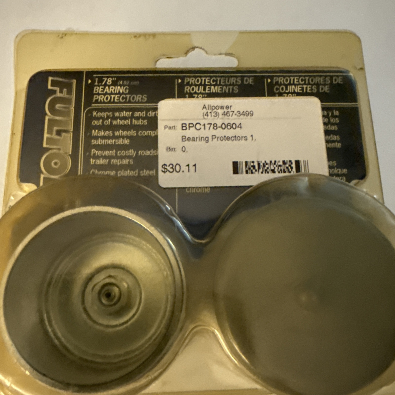 The product is a set of Fulton Bearing Protectors with covers, specifically the BPC178-0604 model. These bearing protectors are designed for use on trailers and are essential for keeping the wheel bearings properly lubricated and protected from water and debris. The Fulton brand is known for producing high-quality trailer parts, ensuring durability and reliability for safe towing.
