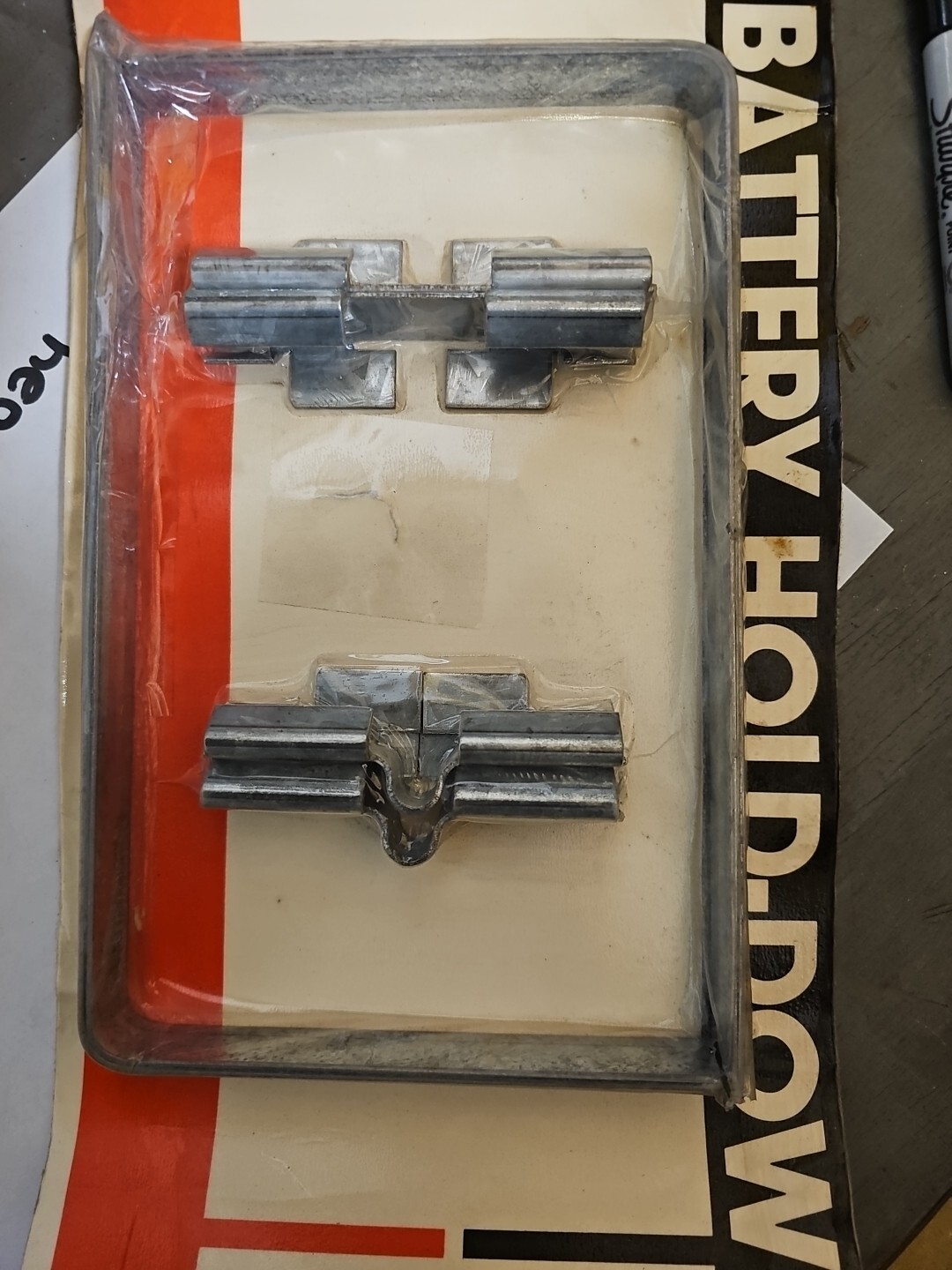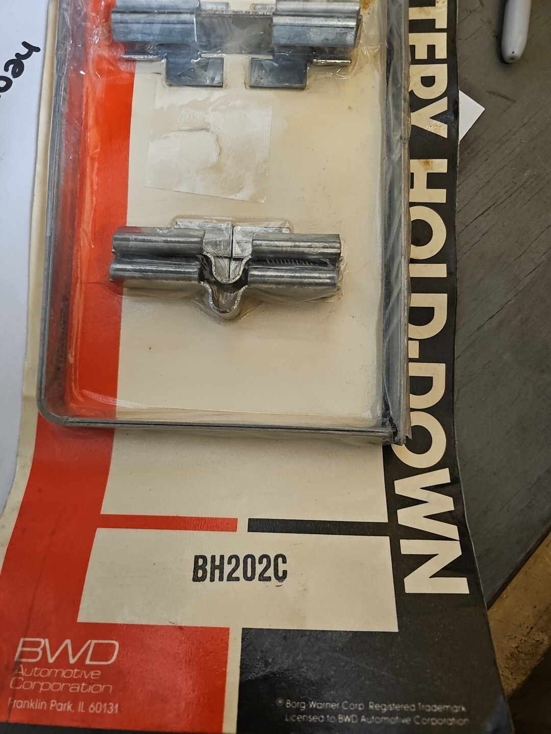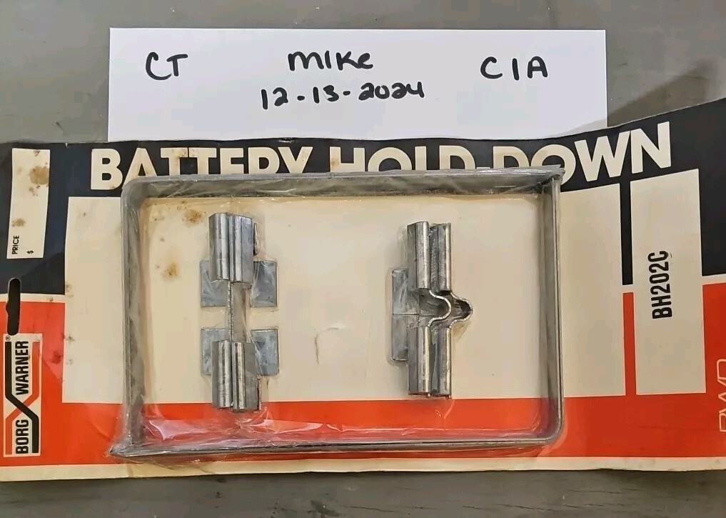 This is a genuine Borg Warner battery hold-down term and hardware, model BH202C. It is suitable for use with vintage cars and trucks, and is a replacement part for the hold-down system. The brand is well-known for its quality and reliability, and this item is no exception. The manufacturer part number is BH 202C, and it is made by Borg Warner.