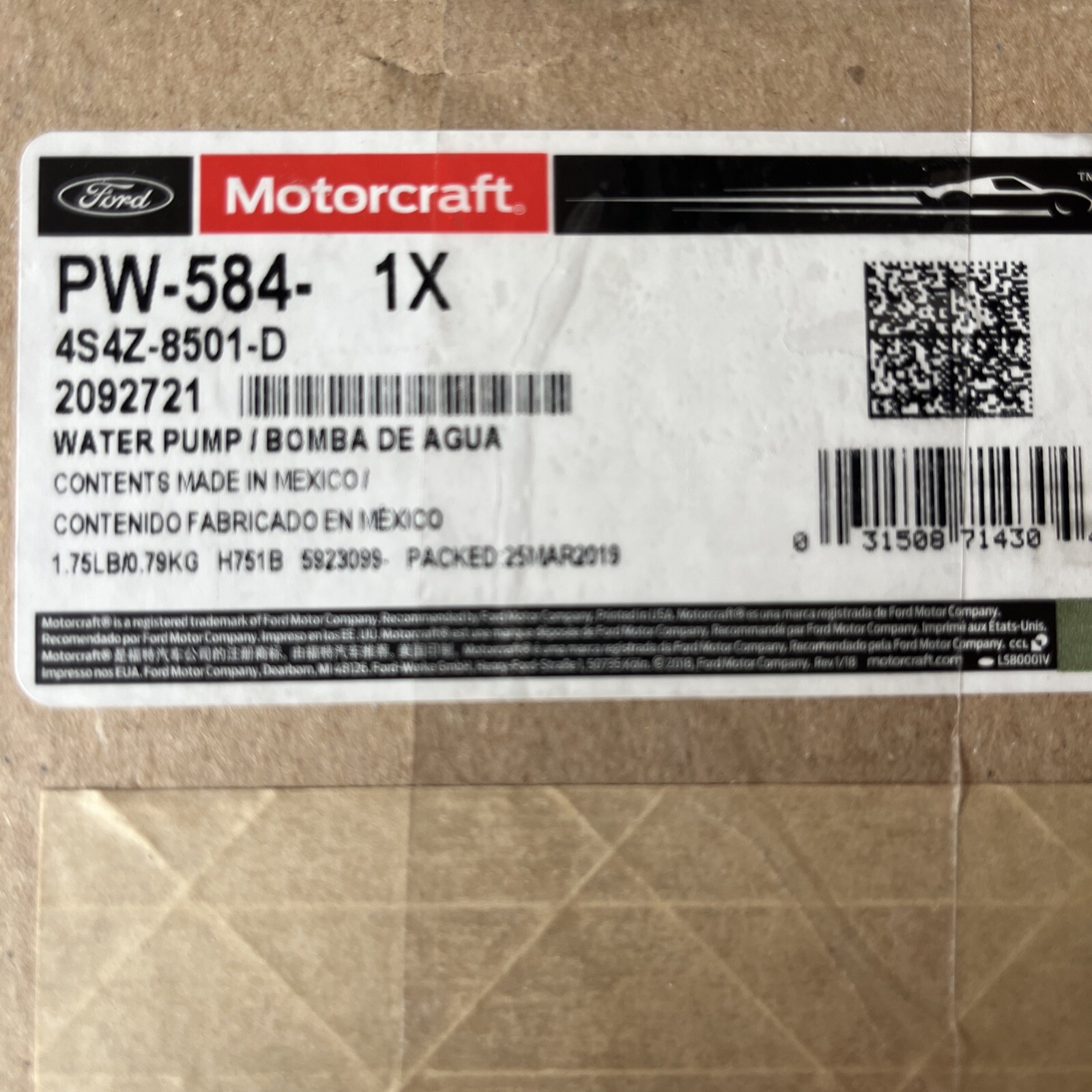 Genuine Ford Motorcraft Engine Water Pump PW-584, 4S4Z-8501-D