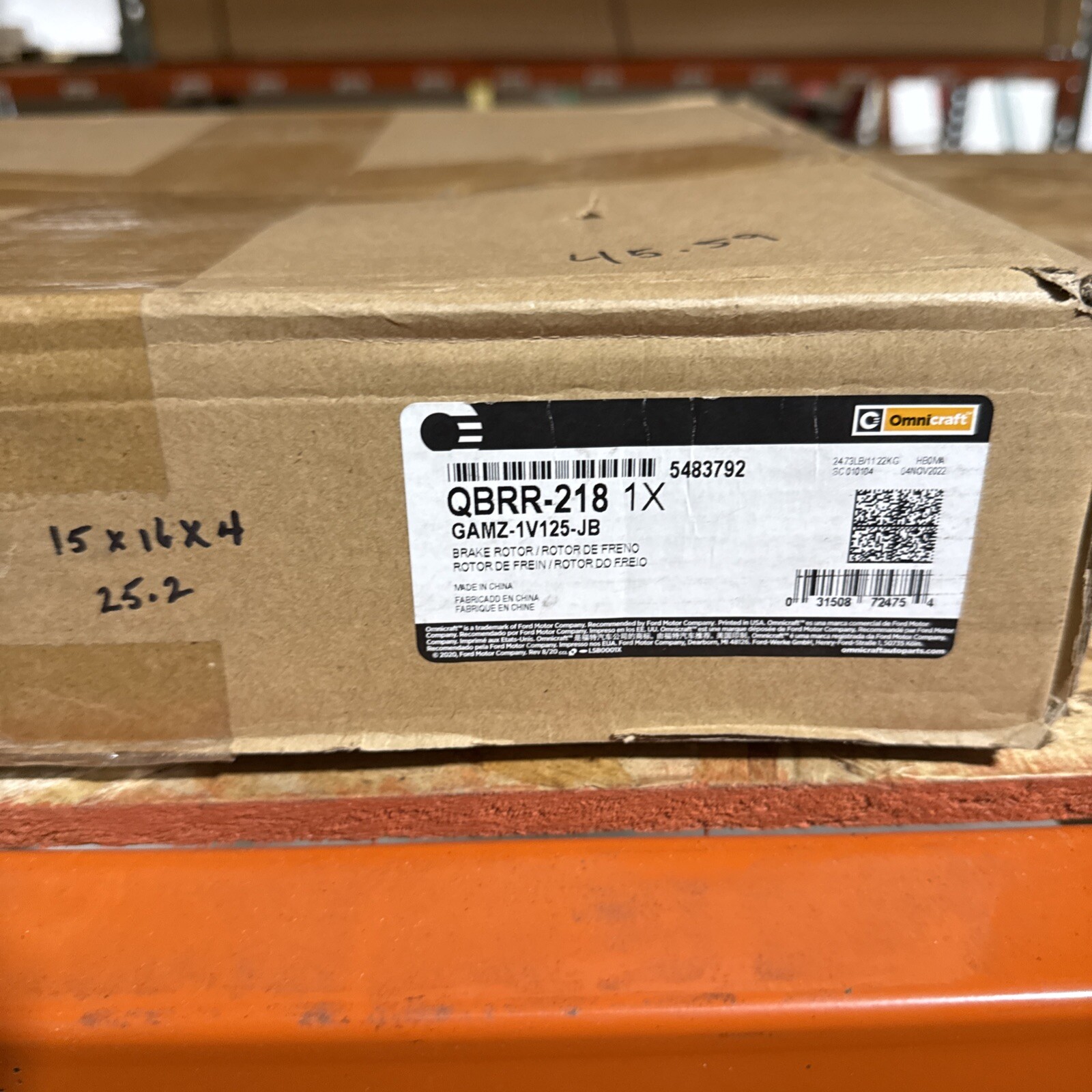 The product is a Genuine Ford Omnicraft QBRR-218 Disc Brake Rotor Assembly with the manufacturer part number GAMZ-1V125-JB. This disc brake rotor is a direct replacement part designed for Ford vehicles, certified as Genuine OEM. The part number provided, GAMZ-1V125-JB, corresponds to the OE/OEM part number for this Ford disc brake rotor, ensuring compatibility with specific Ford models. It is a high-quality component manufactured by Ford for reliable performance and durability in brake systems.