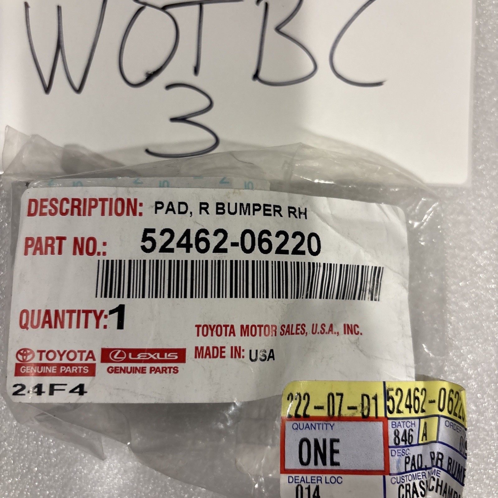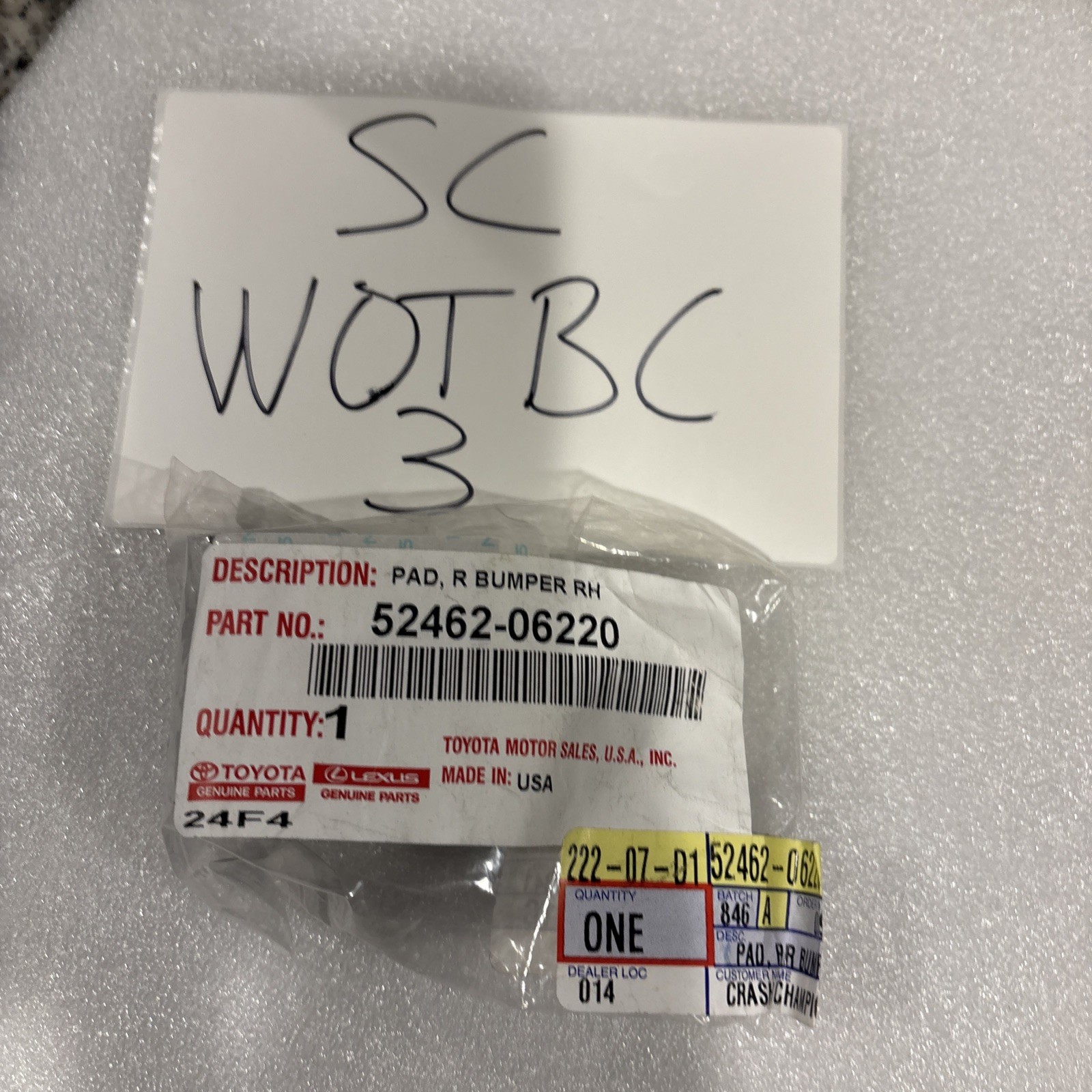 Genuine OEM Toyota 52462-06220 Rear Right Bumper Insulator Pad Foam 5246206220