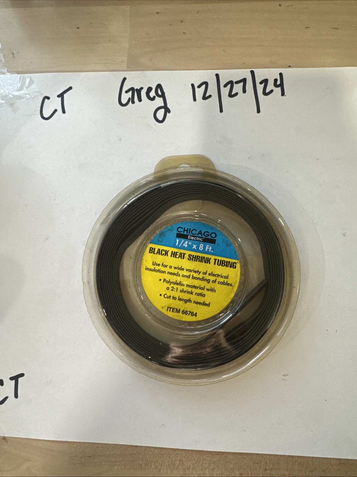 The product is Green Heat Shrink Tubing manufactured by Chicago Electric, featuring a 2:1 shrink ratio. It measures 1/4" in diameter and comes in an 8-foot length. This tubing is designed for a variety of applications such as electrical insulation, wire bundling, and color-coding. Made in China, this tubing is a versatile tool for hobbyists and model builders who require precise and reliable tubing for their projects.