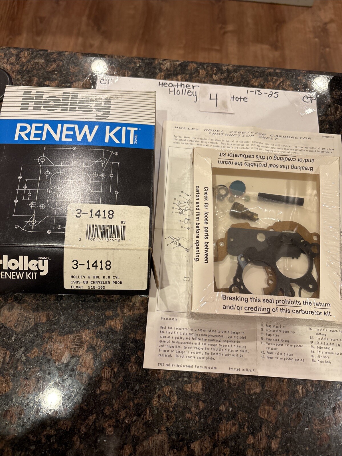 The product is a Holley Renew Kit 3-1418 designed for carburetor models 2280/6280 used in 1985-1988 Chrysler vehicles. This rebuild kit is specifically manufactured by Holley to restore the functionality and performance of the carburetor, providing essential components for maintenance and repair. It is a genuine manufacturer part number 3-1418, ensuring compatibility and quality for Chrysler vehicles from the specified years. This kit is ideal for those looking to maintain their carburetor's performance and extend its lifespan.