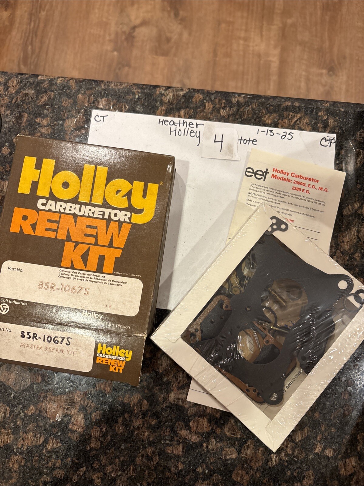 The product is a Holley Renew Kit (Part number 85R-1067S) designed for specific carburetor models including 2300G, EG, MG, and 2380EG. This kit includes essential parts for rebuilding and refreshing these carburetors, ensuring optimal performance and efficiency. With the Holley brand known for quality automotive parts, this Renew Kit is a reliable choice for maintaining and servicing carburetors in various car and truck models.