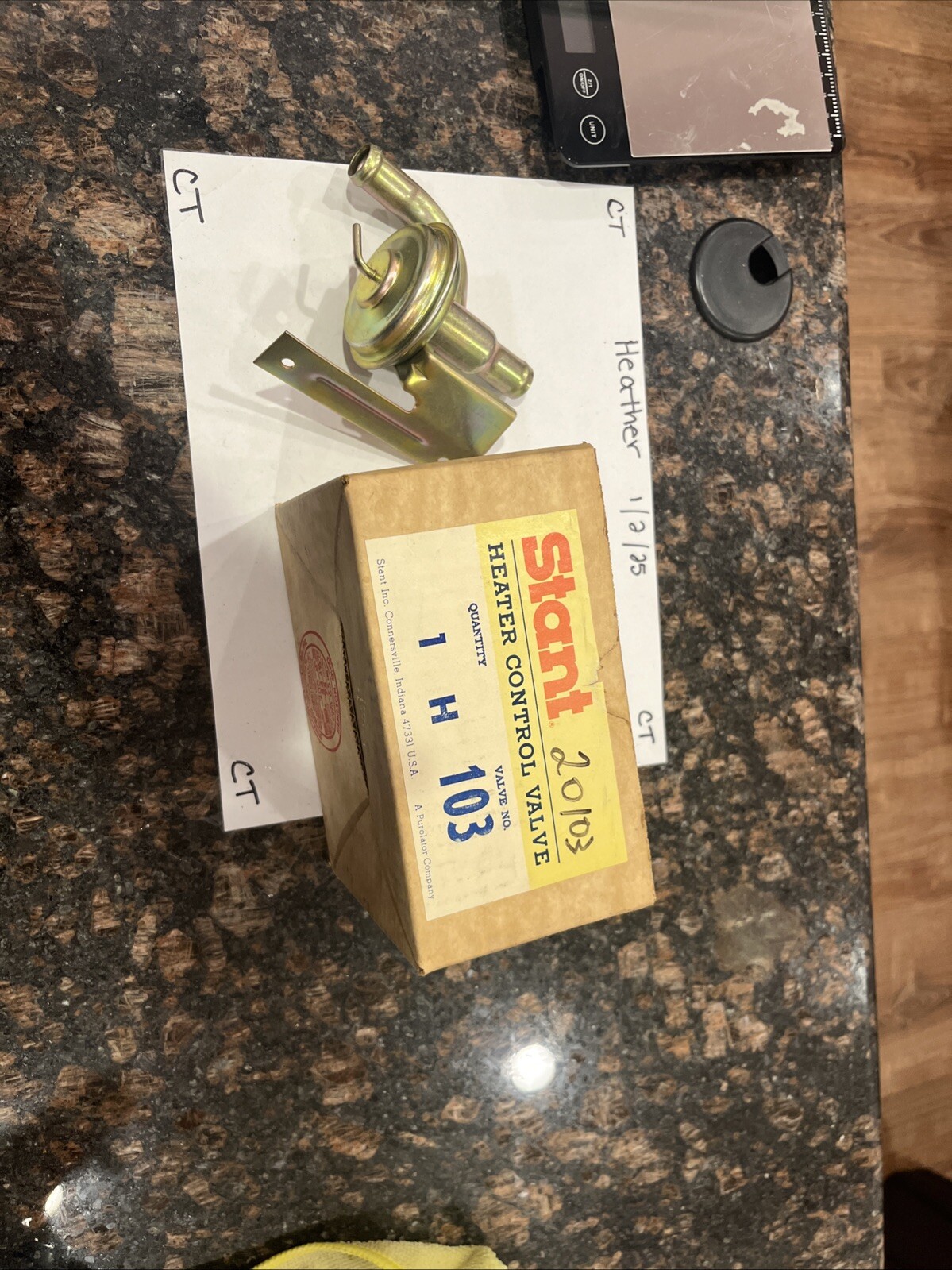 The product is an HVAC heater control valve, specifically the Stant brand Heater Control Valve with a manufacturer part number of H-103. This valve is designed for use in controlling the flow of coolant to the heater core in a vehicle's heating system.