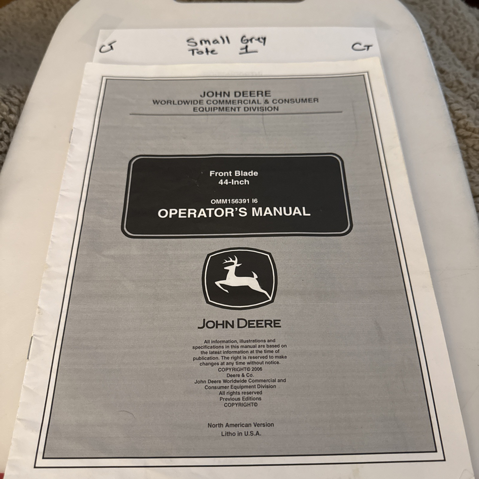 The product is an operator's manual for the John Deere Front Blade 44" attachment, specifically identified as the Omm156391 model. This manual is designed to provide detailed instructions and guidance on how to properly operate and maintain the front blade attachment for John Deere equipment. It is an essential resource for users looking to maximize the performance and longevity of their equipment, ensuring safe and efficient operation.