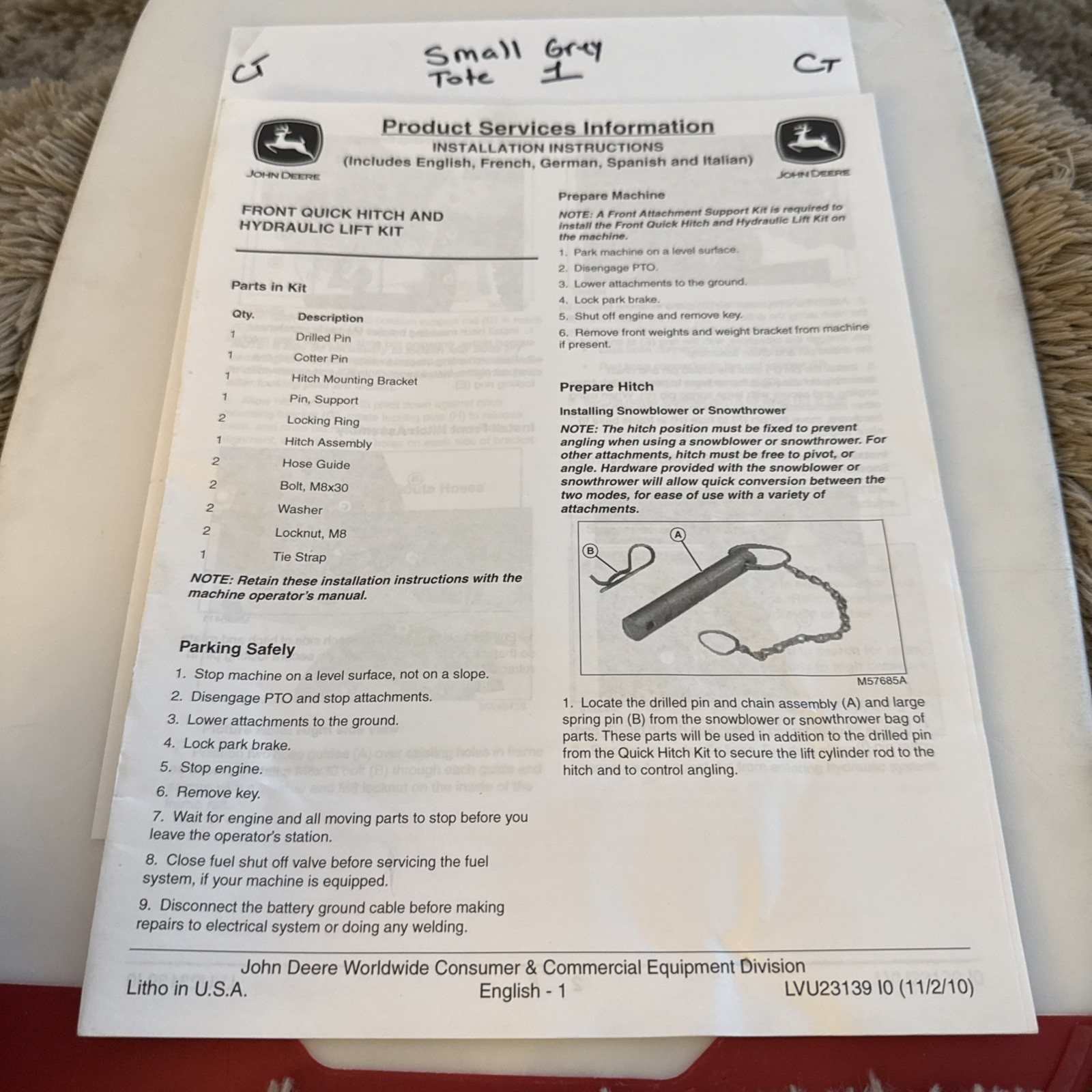 The John Deere Front Quick Hitch & Hydra Lift Kit Installation Instructions LVU23139 is a comprehensive manual designed for agriculture enthusiasts and John Deere collectors. This product specifically pertains to the installation of the front quick hitch and hydra lift kit for John Deere equipment, showcasing the brand's commitment to quality and innovation in the field of agriculture. With a focus on utility and functionality, this manual serves as a valuable resource for individuals looking to enhance the capabilities of their John Deere machinery.
