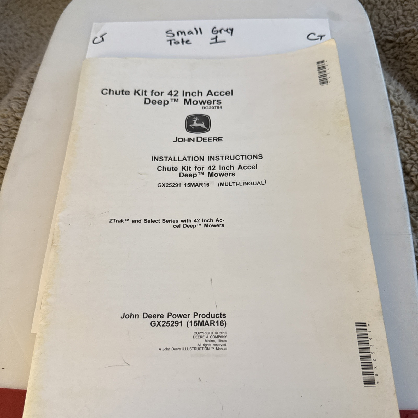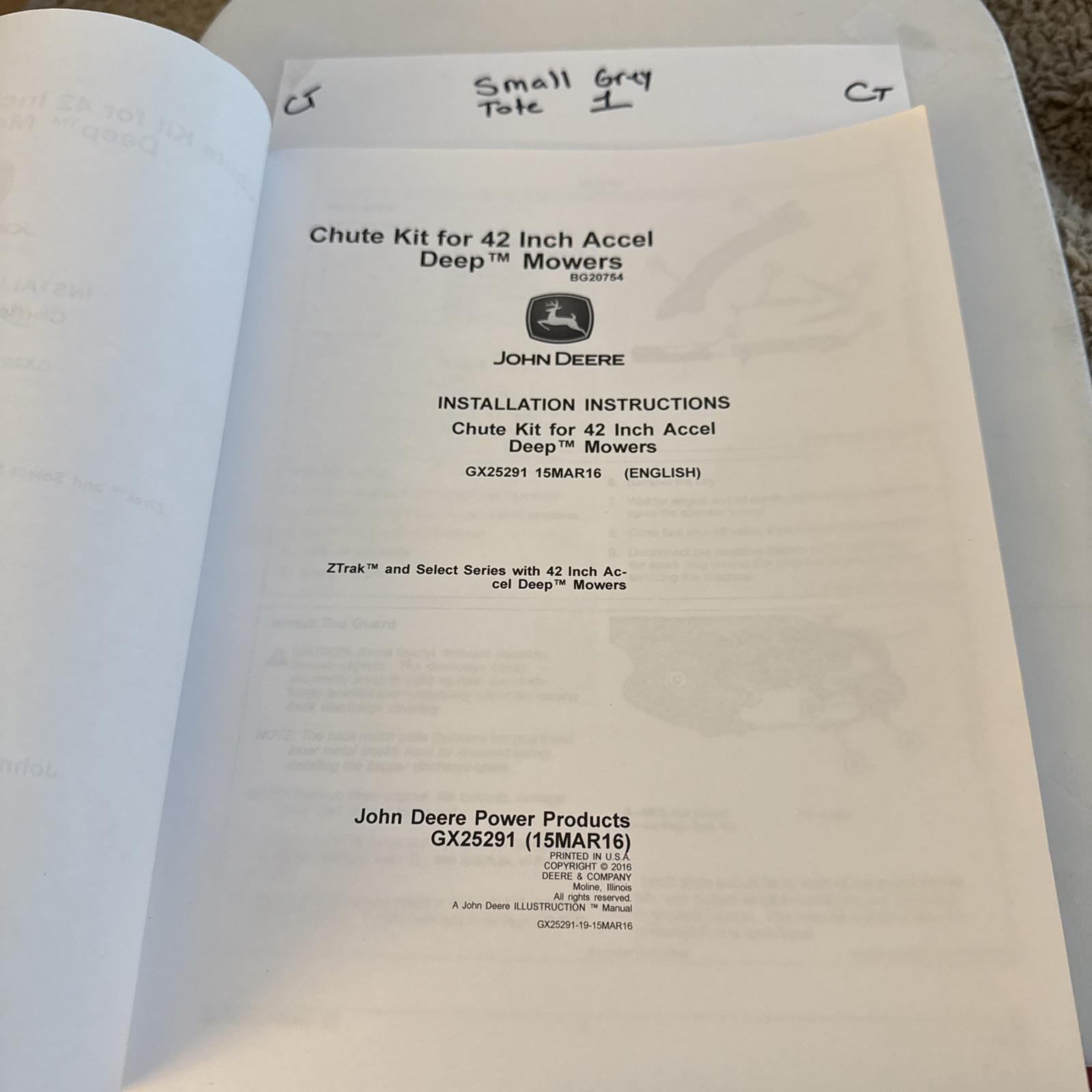 The product is a set of installation instructions for a chute kit designed for 42" Accel Deep mowers made by John Deere. The chute kit, identified by the part number GX25291, is intended for use with John Deere equipment in the agriculture sector. These instructions are likely to guide users on how to properly attach and utilize the chute kit with their mowers, ensuring efficient operation and optimal performance in managing grass clippings during the mowing process.