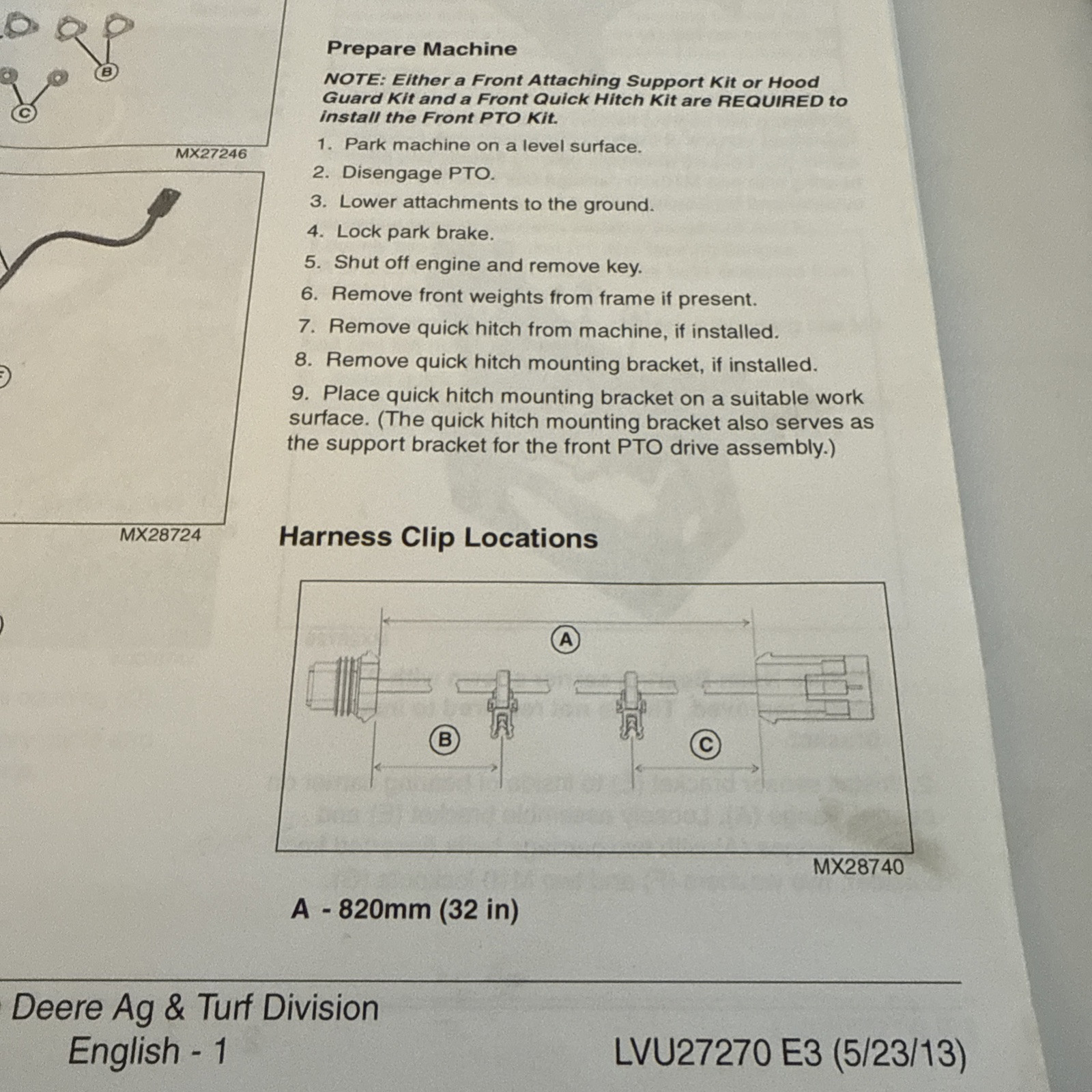 The product is a set of installation instructions for the John Deere LVU27270 Front PTO Kit, designed for use with John Deere equipment. The brand associated with this product is John Deere, known for its agricultural machinery. The theme of the product is agriculture, indicating that it is specifically tailored for use in farming and related activities. These instructions are likely intended to guide users through the process of installing the front power take-off kit on their John Deere equipment, ensuring proper functionality and performance in agricultural operations.