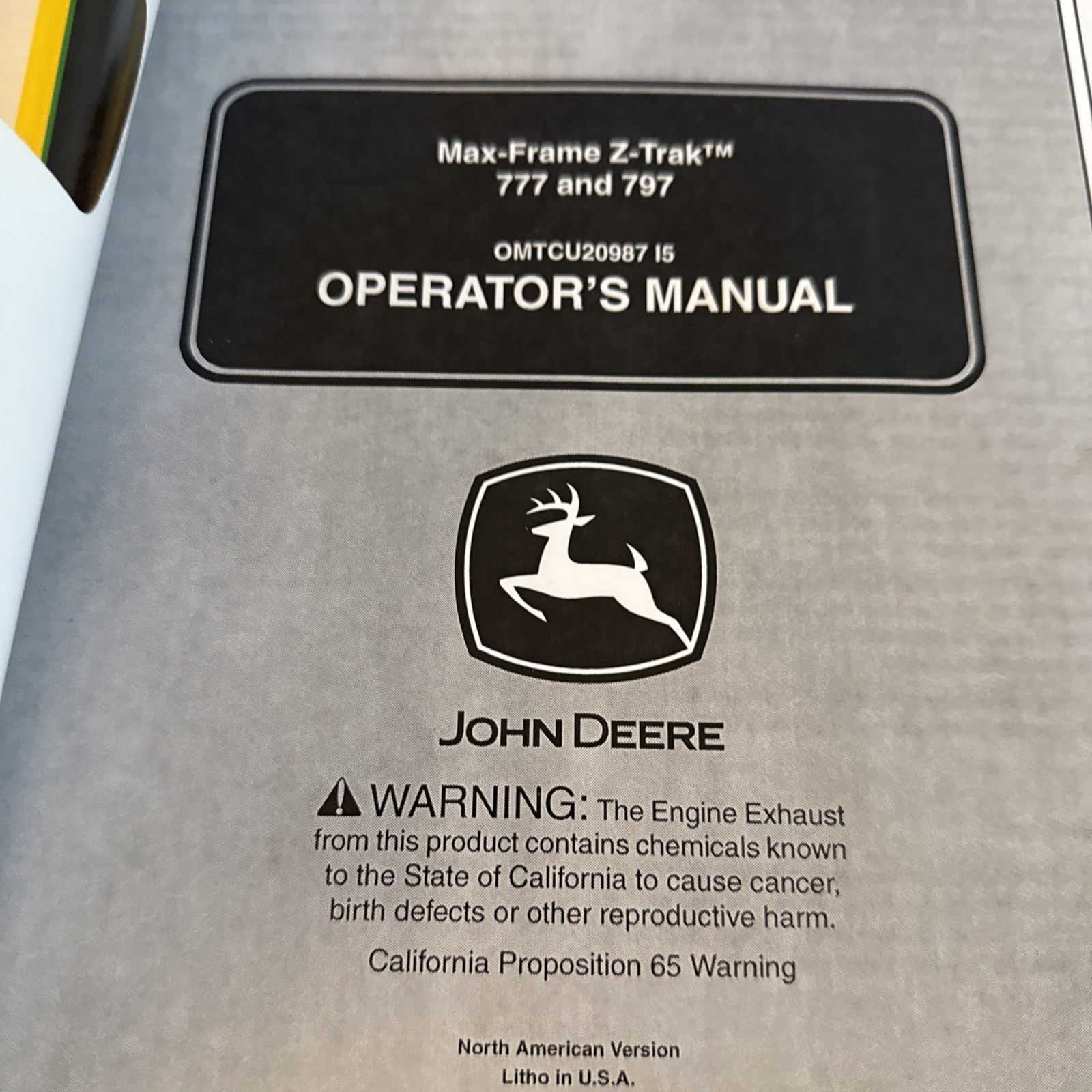 The product is a manual for the John Deere Max-frame Z-Trak 777 and 797 models, specifically identified as OMTCU20987 L5. This manual likely contains essential information for the operation, maintenance, and troubleshooting of these heavy equipment machines. As a guide provided by the brand, John Deere, it is tailored to ensure proper functioning and longevity of the Max-frame Z-Trak 777 and 797 models, making it a valuable resource for those who own or work with these specific heavy equipment units.