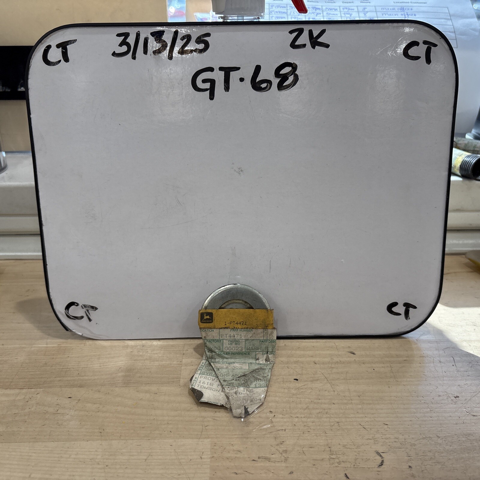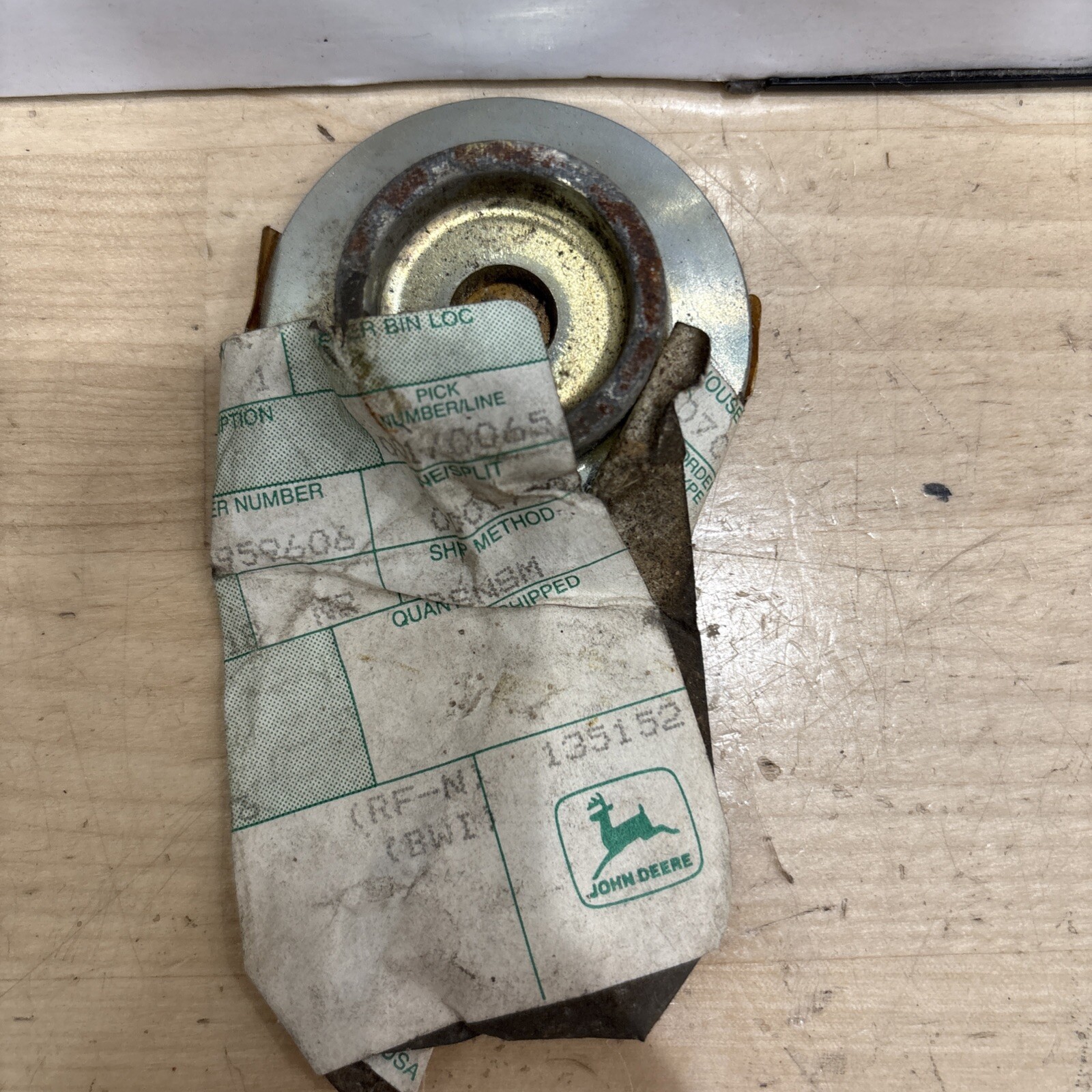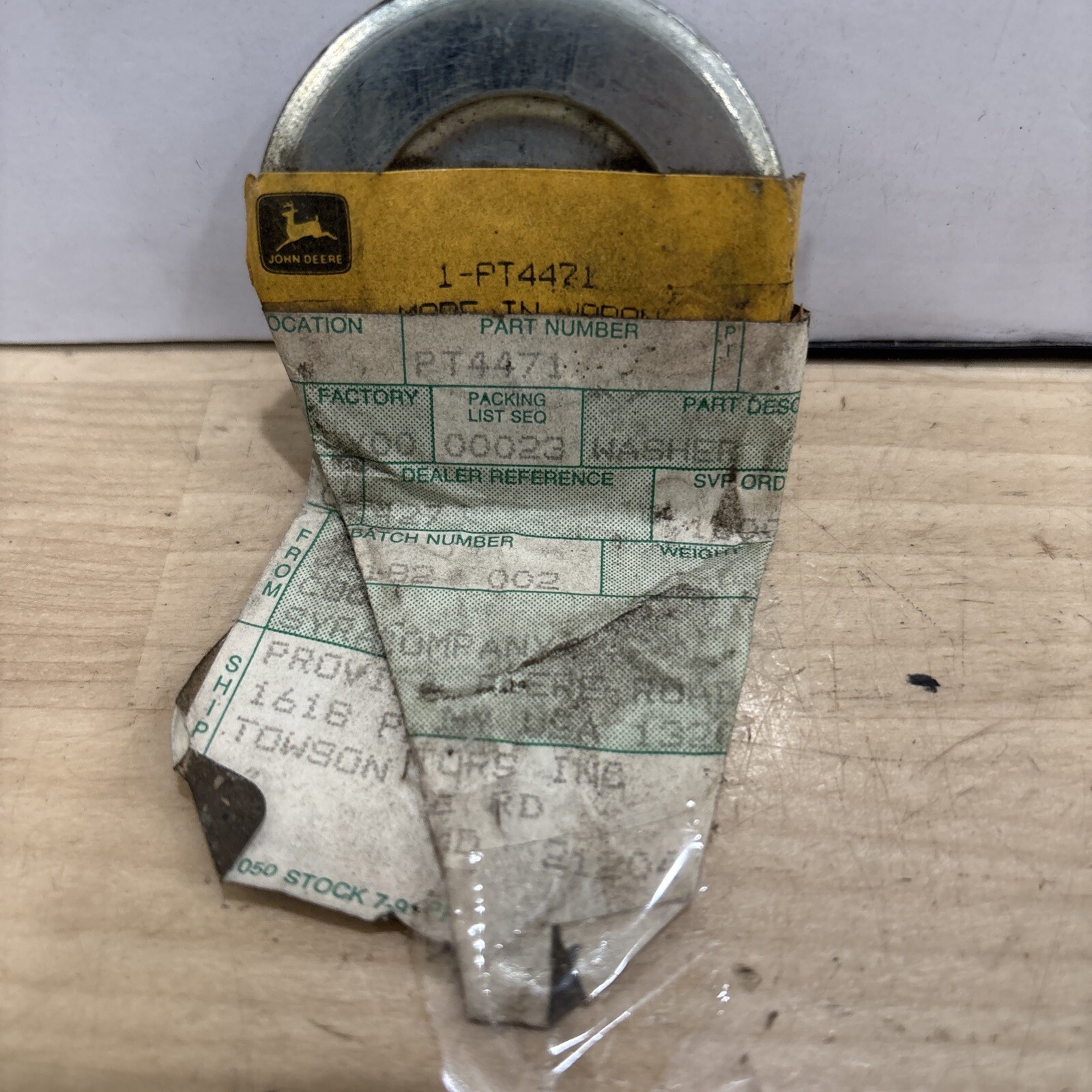 The product is a John Deere PT4471 cap with some surface rust/oxidation present. It is a heavy equipment part or accessory designed for use with John Deere machinery. The cap may be used for various purposes within the equipment, such as securing or covering components. It is important to note that the cap may have signs of wear due to the surface rust/oxidation, which could potentially impact its appearance or functionality.