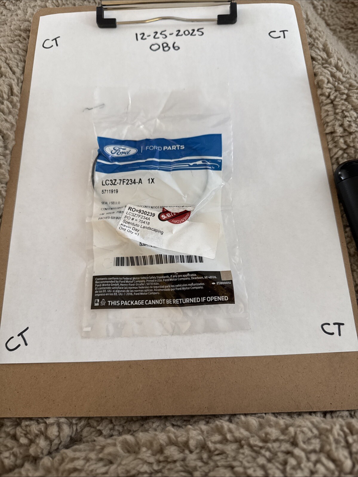 The product is a genuine OEM Ford seal with the manufacturer part number LC3Z7F234A. It is designed for use in vehicles and is a non-returnable item due to its electrical components. This seal is specifically manufactured by Ford, ensuring quality and compatibility with the vehicle it is intended for.