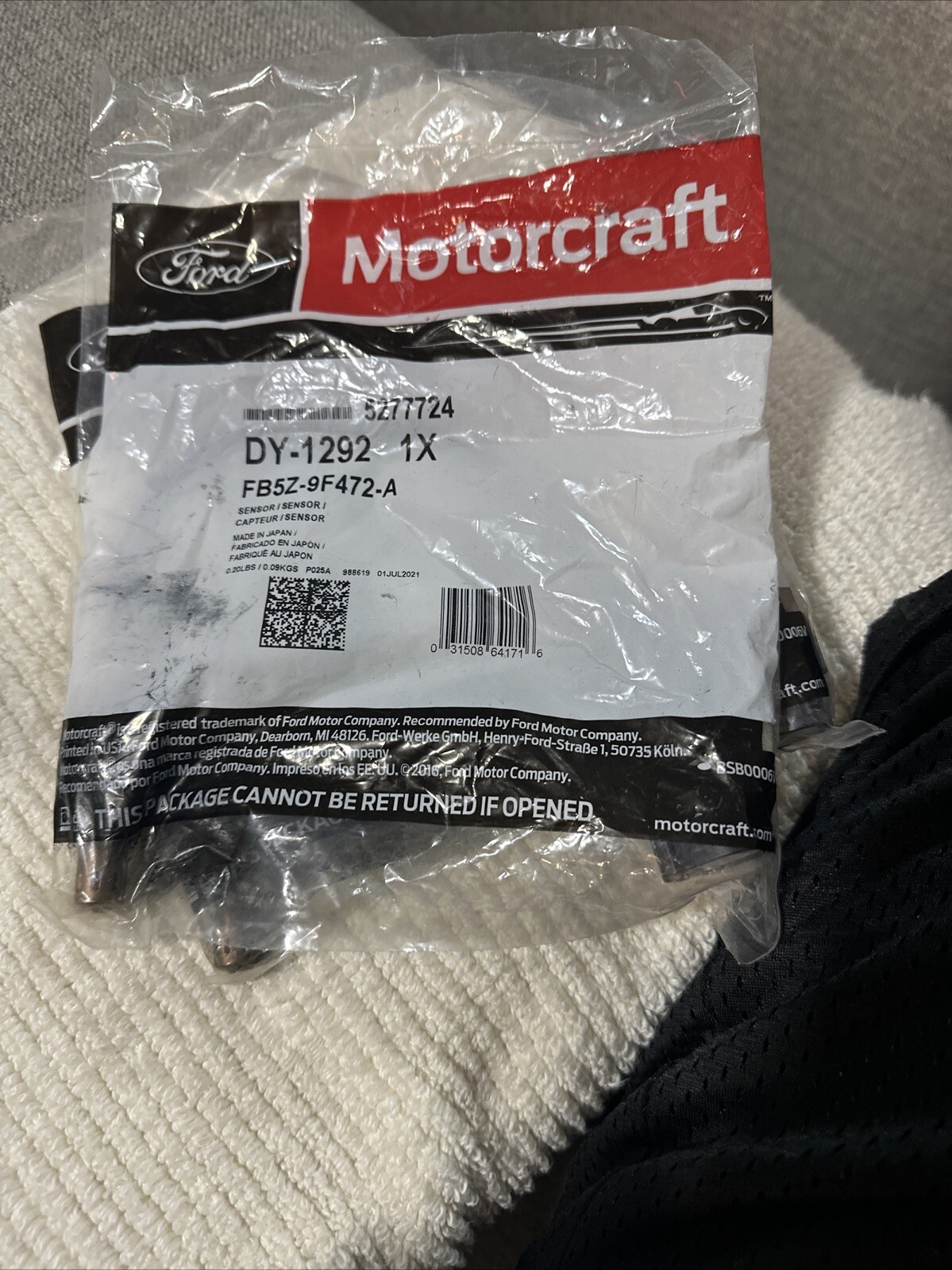 This is a new, genuine Motorcraft DY-1292 oxygen sensor for Ford vehicles, with part number FB5Z-9F472-A and one sensor included in the package. It is an OEM product designed to measure the oxygen content in the exhaust gas to optimize engine performance. The sensor is intended for use on the exhaust and is compatible with several Ford models.