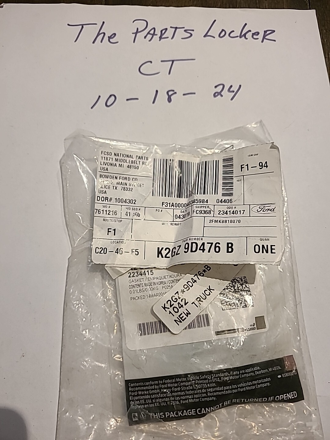 This genuine Ford EGR cooler gasket is a direct replacement for your vehicle. It is made with high-quality materials to ensure a perfect fit and lasting durability. The product name is K2GZ-9D476-B and it is a genuine OEM part.