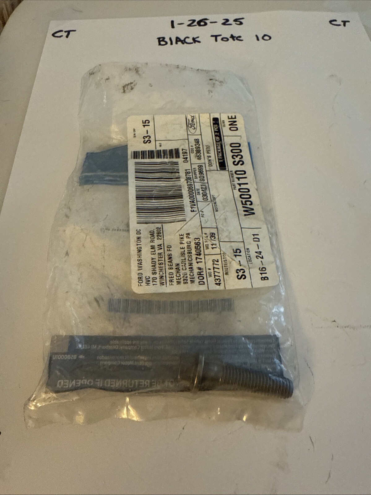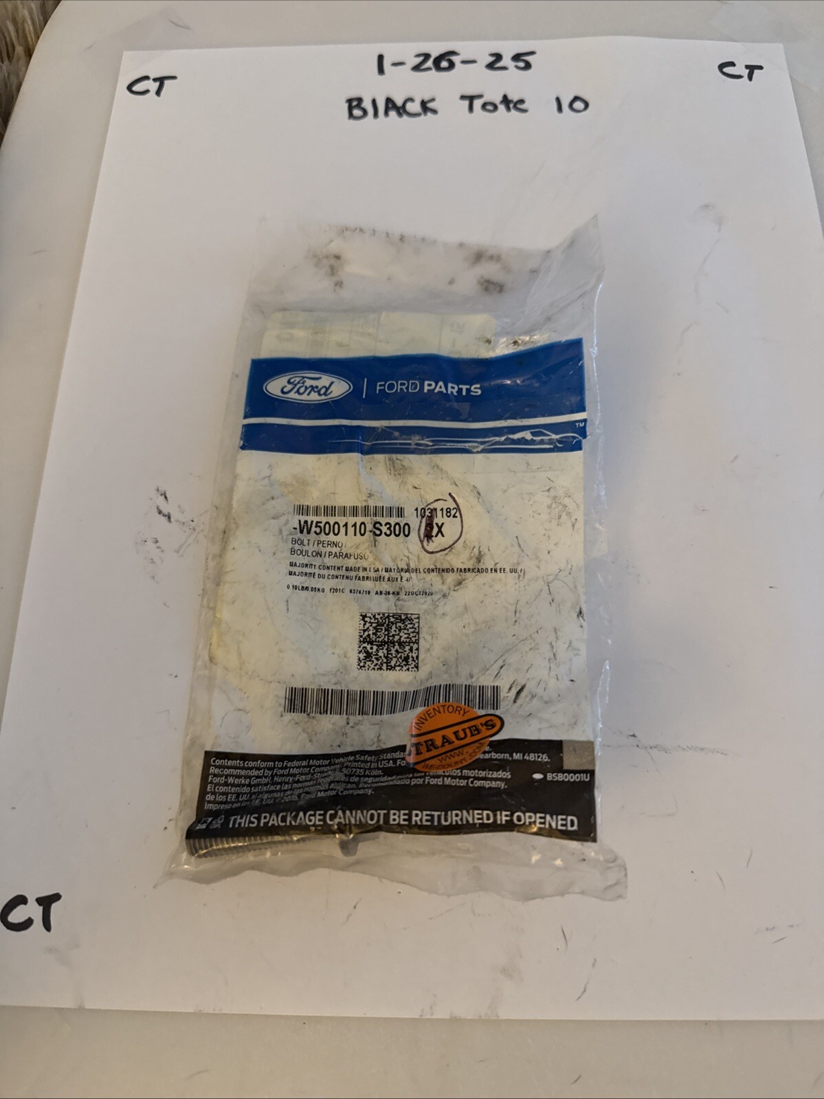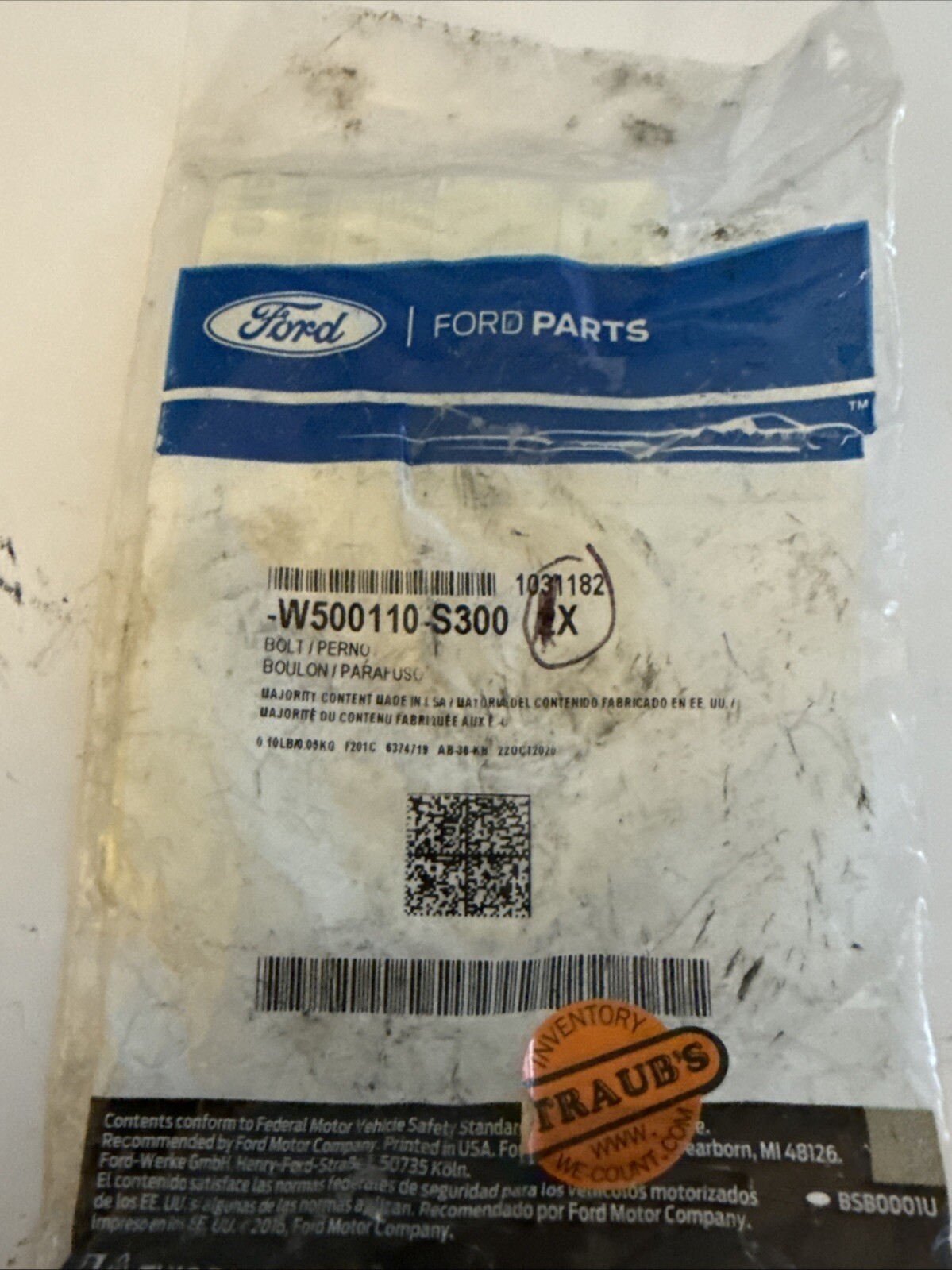 The product is a New OEM Ford bolt with the manufacturer part number W500110-S300. It is a genuine Ford part designed for specific use in Ford vehicles. The SKU number is AG035-27, indicating the unique identification code for this particular bolt. The item is brand new and has never been used, making it a NOS (New Old Stock) product. This Ford bolt is essential for maintaining and repairing Ford vehicles, ensuring a proper fit and performance.