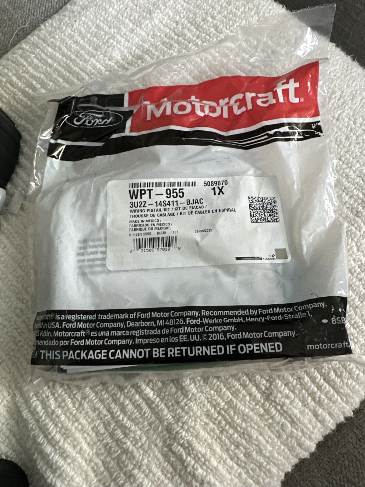 This OEM Motorcraft wiring pigtail harness kit is brand new and unused, ready to be installed in your vehicle. The kit includes part numbers WPT-955 and 3U2Z-14S411-BJAC, both manufactured to high standards for quality and durability. The SKU for this item is IA004-23.