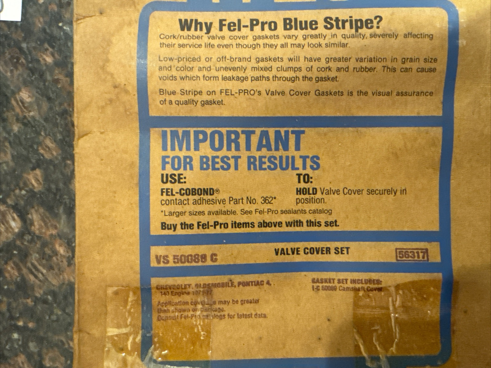 This is a brand new old stock Fel-Pro engine valve cover blue stripe gasket set with manufacturer part number VS50089C. It is made in the United States and comes with no warranty. The gasket set is designed for use in various car and truck engines and is suitable for those looking for a replacement or upgrade part.