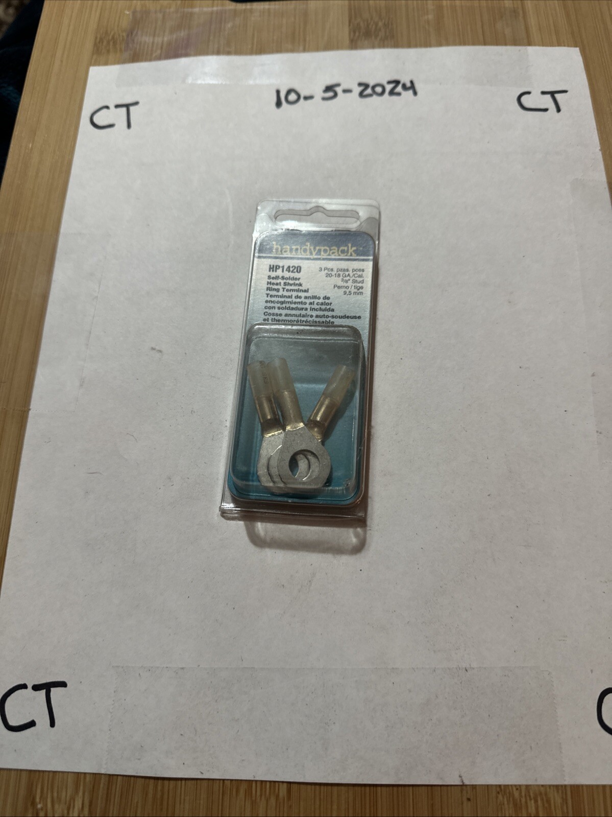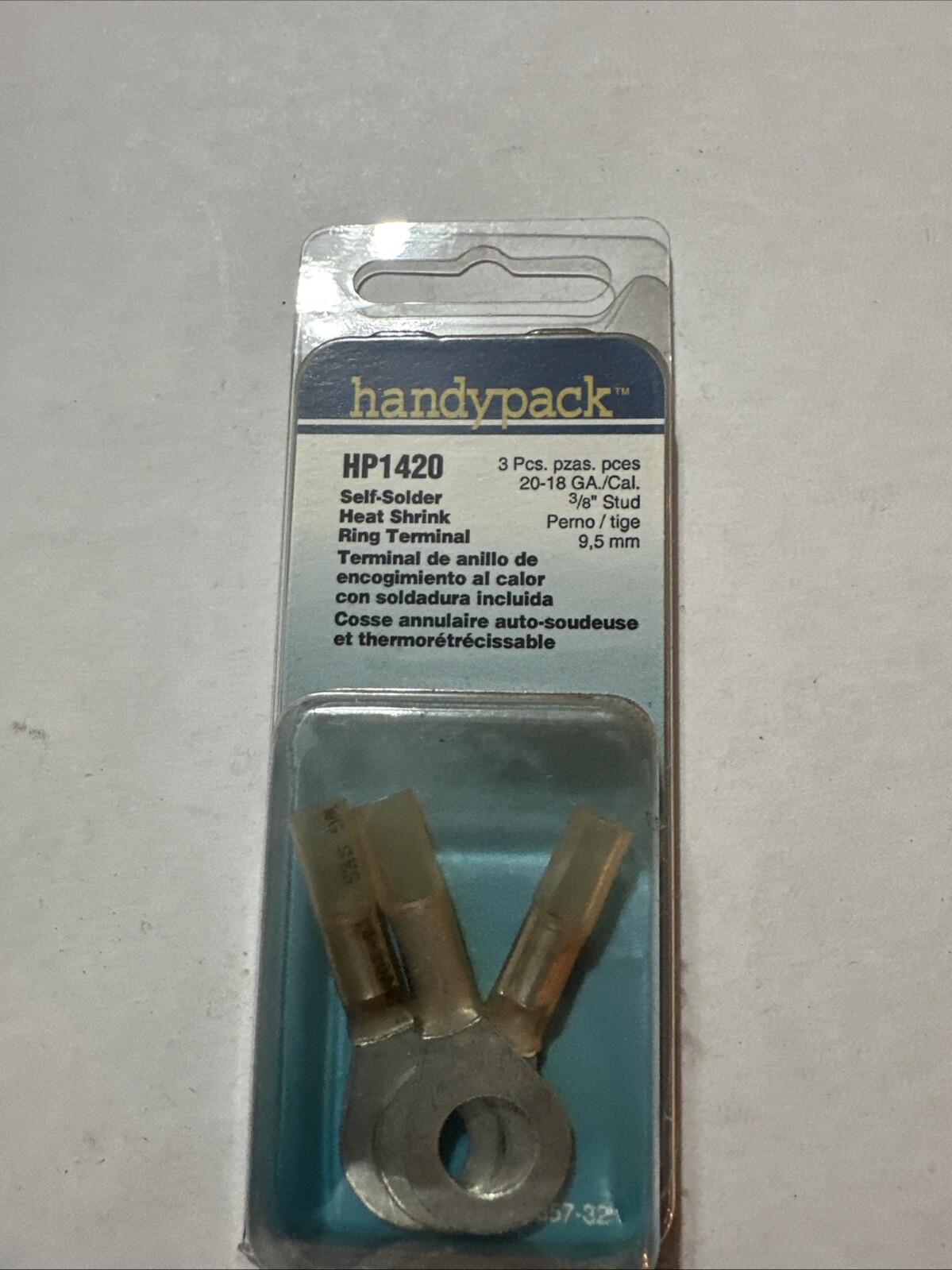 Introducing the SMP Handy Pack Primary Ignition Terminal HP1420, a high-quality product designed for direct replacement in your vehicle's ignition system. The package includes three terminals with a 3/8" stud size and 22-18 ga. gauge, made of solder terminals with dual wall heat shrink material for a durable and reliable connection.