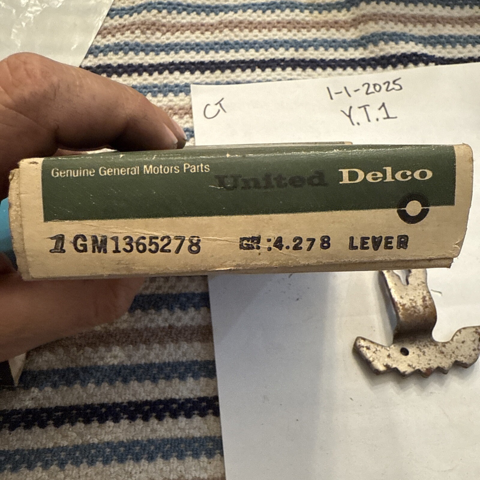 The product is a NOS (New Old Stock) transmission range selector and park lock lever designed for Oldsmobile models including Cutlass, F85, Starfire, 88, 98, Ninety Eight, and Fiesta from the years 1964 to 1969. Manufactured by United Delco in the United States, the part number 1365278 is specified for this item. It is a genuine part with an unspecified warranty length, suitable for vintage Oldsmobile vehicles needing replacement of these components. Please refer to the description for further details about this product.