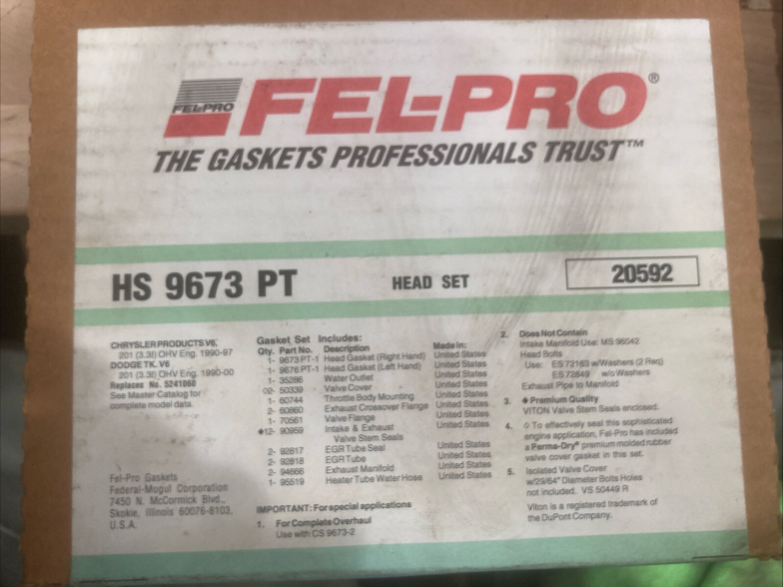 The NOS Fel-Pro HS 9673 PT Head Gasket Set is a kit manufactured by Fel-Pro in the United States. It includes a head gasket and is designed specifically for use in engines. This set is a reliable choice for those in need of a high-quality replacement head gasket, with the manufacturer part number HS 9673 PT ensuring compatibility with various vehicle models. Ideal for automotive enthusiasts or professionals looking for a durable and efficient solution for engine repair or maintenance tasks.