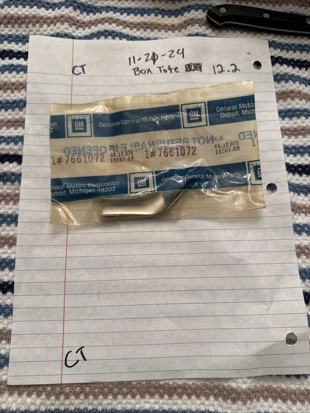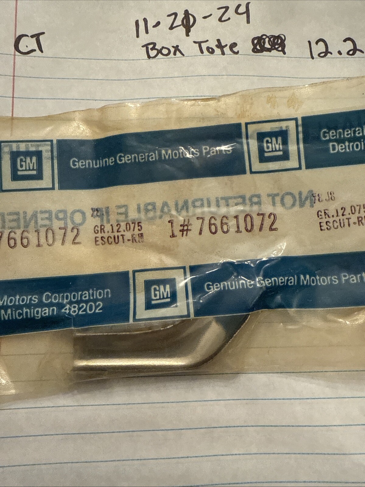 This listing offers a genuine GM OEM part with the manufacturer part number 7661072. It is a NOS (New Old Stock) item, meaning it is a brand new part that has never been used before. The part is an escutcheon, which is a decorative plate or emblem that covers a screw or bolt head.