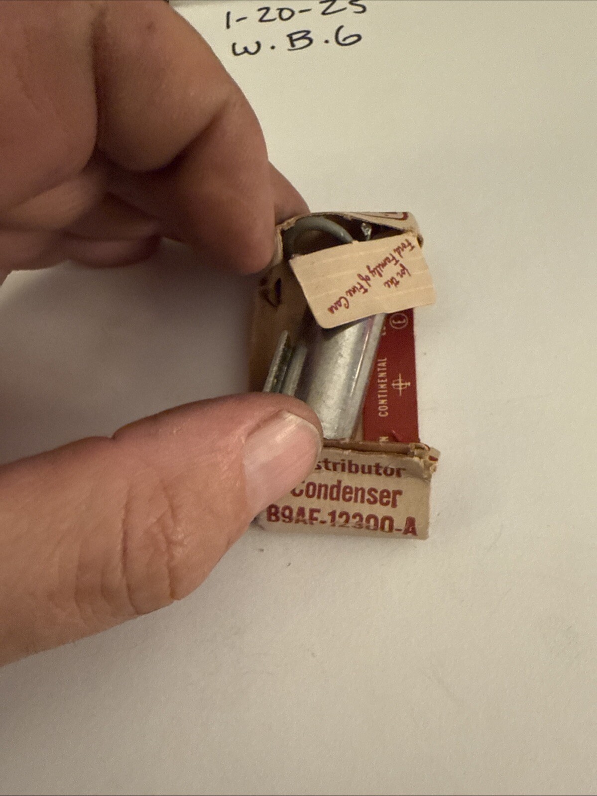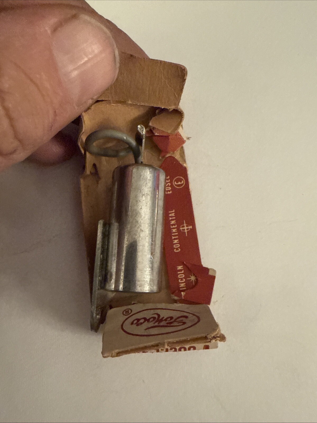 The product is a vintage NOS (New Old Stock) Ford Fomoco distributor condenser, specifically designed for Mustang models from 1965 and 1966. The part number is B9AF-12300-A and it can also be referred to as Autolite DC-13 or DC-13A. This ignition condenser is a genuine Ford product manufactured in the United States and is suitable for classic car restoration projects. It is a reliable component for ensuring proper ignition system function in these specific Mustang models.