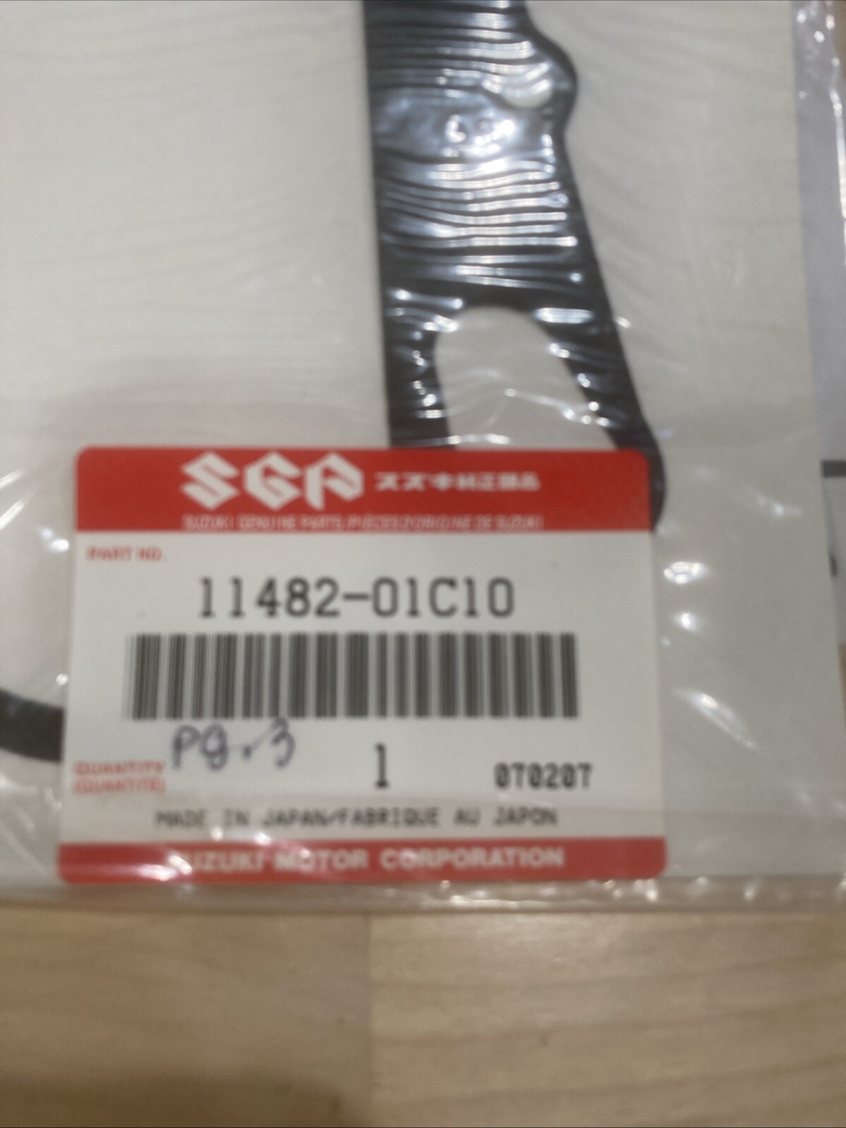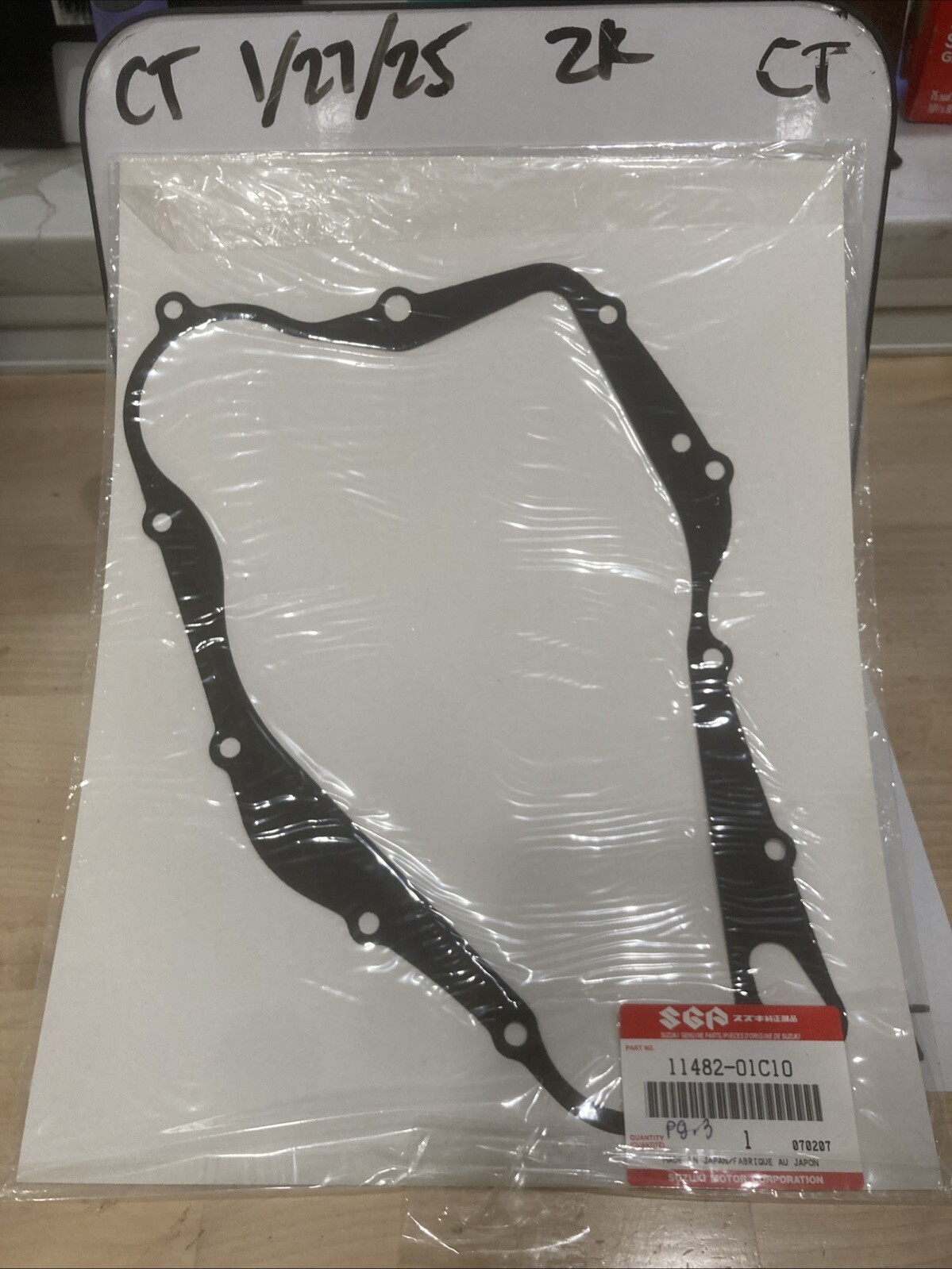 The product is a NOS Suzuki LT 250 Quadracer clutch cover gasket with the manufacturer part number 11482-01C10. This gasket is compatible with Suzuki LT250 models from 1985 to 1991 and is made in Japan. It is a genuine Suzuki part, indicating high quality and precise fit for the specified model year range. The gasket is essential for maintaining the proper function of the clutch cover on the Suzuki LT 250 ATV.