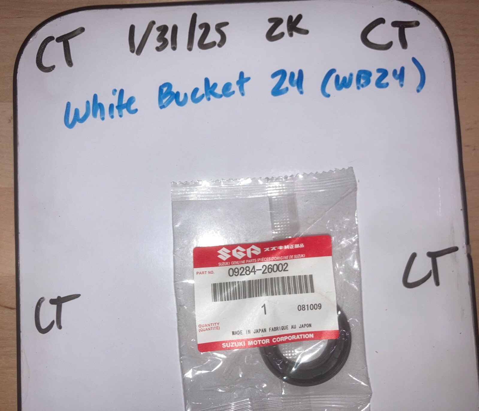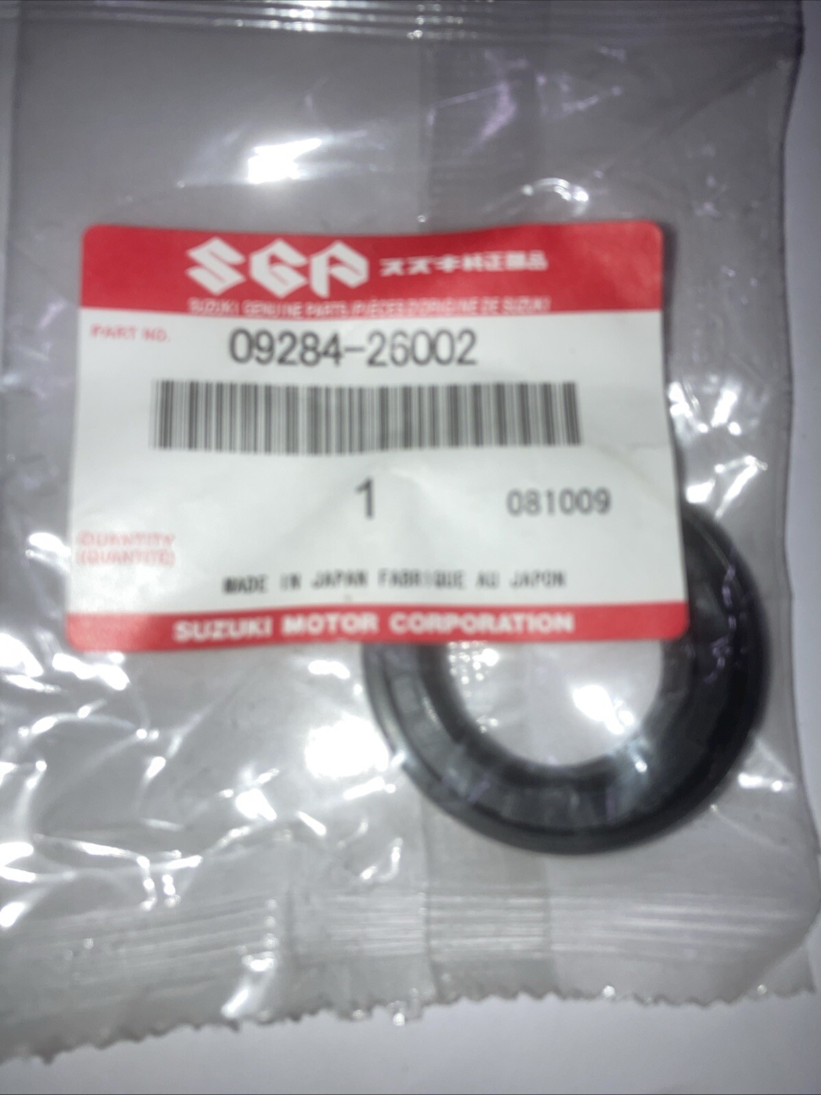 This is a vintage NOS (New Old Stock) Suzuki OEM Dust Seal suitable for the 1987-1990 LT500R and 1985-1992 LT250R models. The part number is 09284-26002, and it was manufactured in Japan by Suzuki. This dust seal is specifically designed for these Suzuki models from the late 1980s to early 1990s, ensuring a proper fit and function for restoration or maintenance purposes.