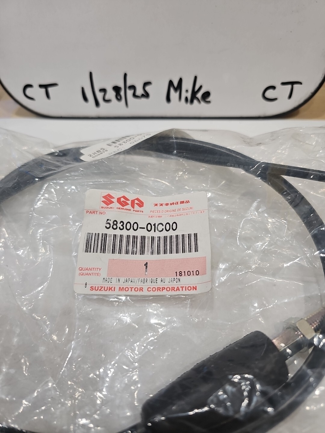 The product is a new old stock (NOS) Suzuki OEM throttle cable designed for the 1985-1992 LT250R Quad Racer model. It has a manufacturer part number of 58300-01C00 and is a vintage part made in Japan. This throttle cable is specifically compatible with Suzuki brand motorcycles and is suitable for use in the years 1985 onwards. It is a genuine Suzuki part that can be used as a replacement for original equipment on the LT250R Quad Racer model.